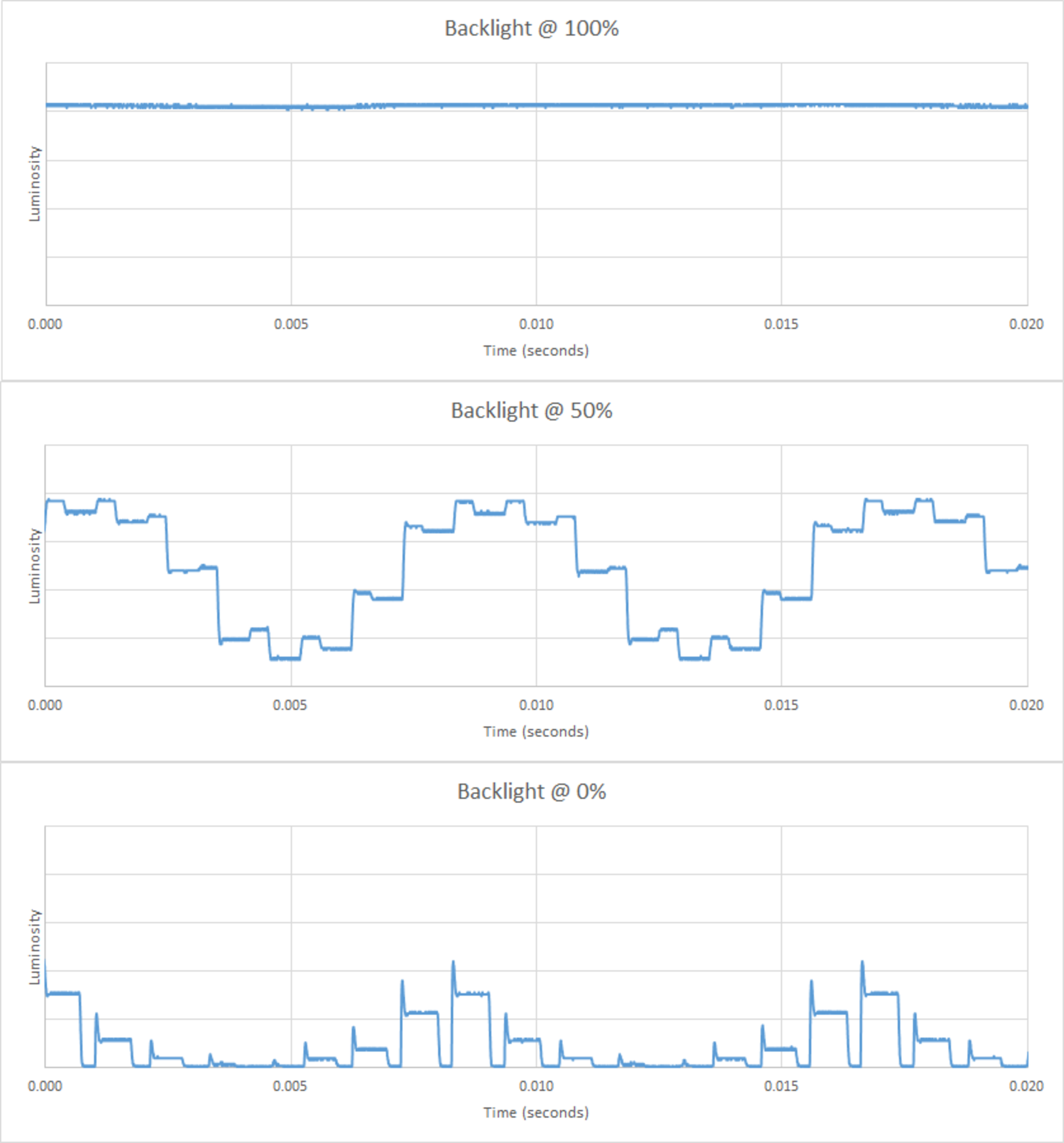 The backlight frequency is 120 hz (see a chart of the pattern here). Note that on our M60-C3, the clear action setting was just the equivalent of lowering the backlight. This is different from what it does on our E60-C3, where it does change the flickering.