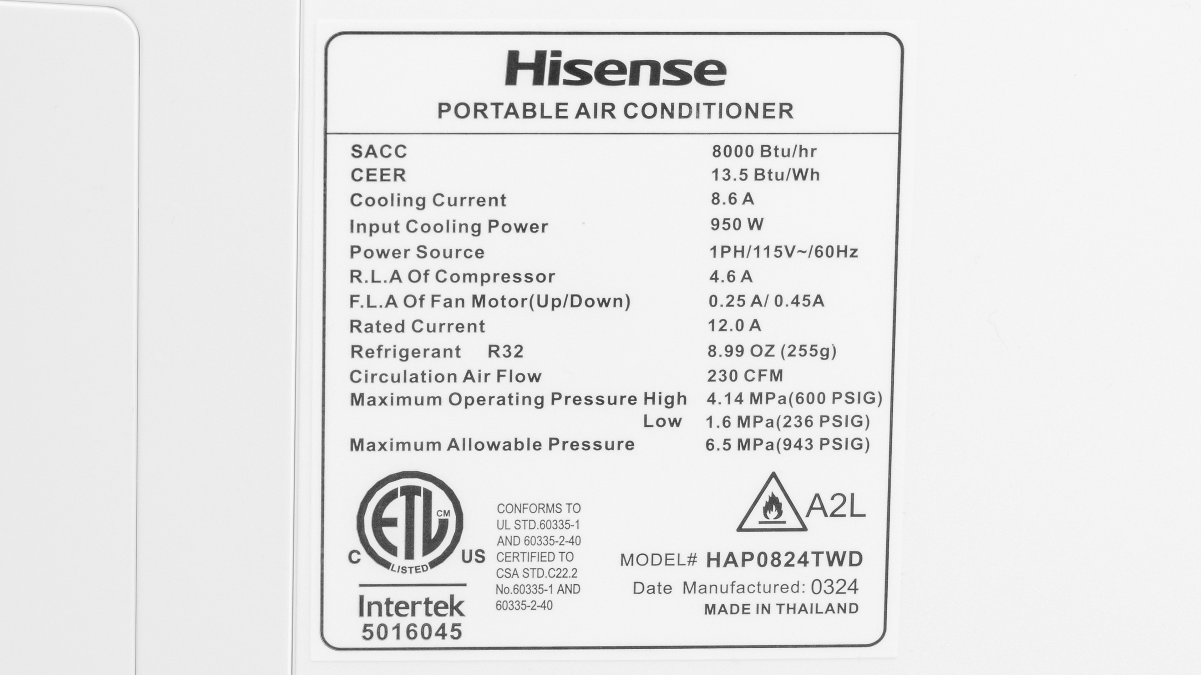 The Hisense HAP0824TWD's overall efficiency is mediocre. Despite its dual-hose design and inverter compressor, its upfront energy demands are higher than models with similar cooling capacity.