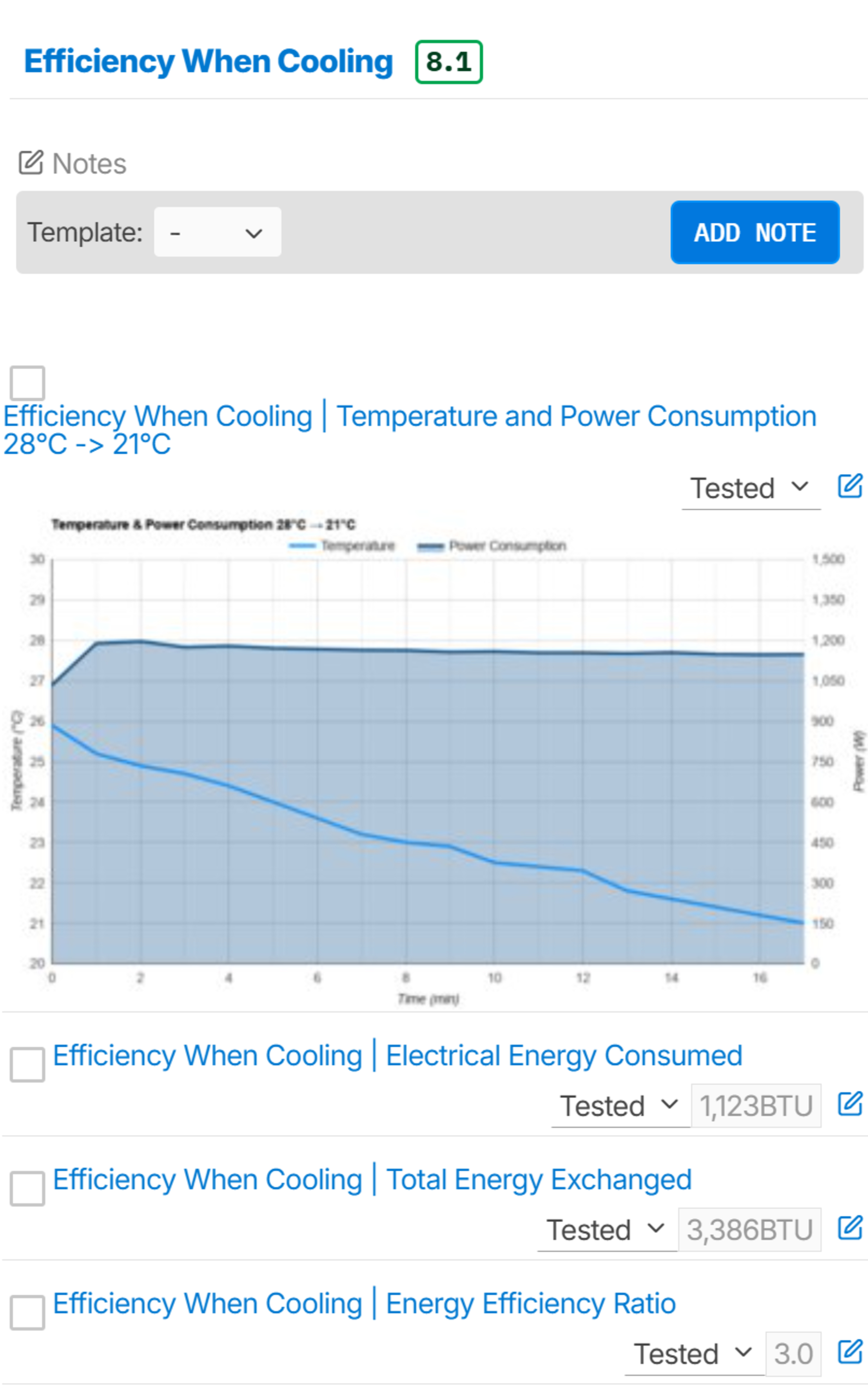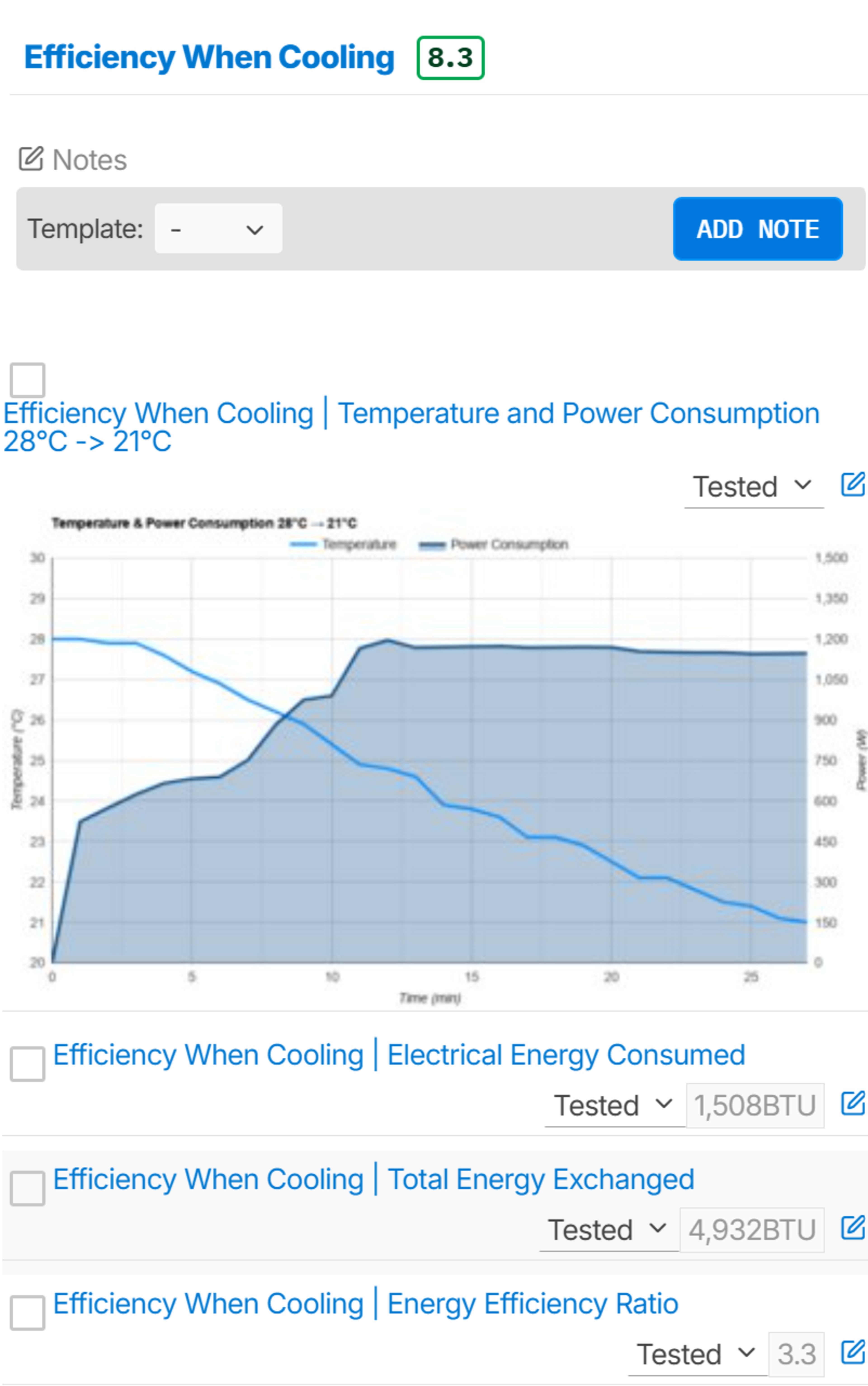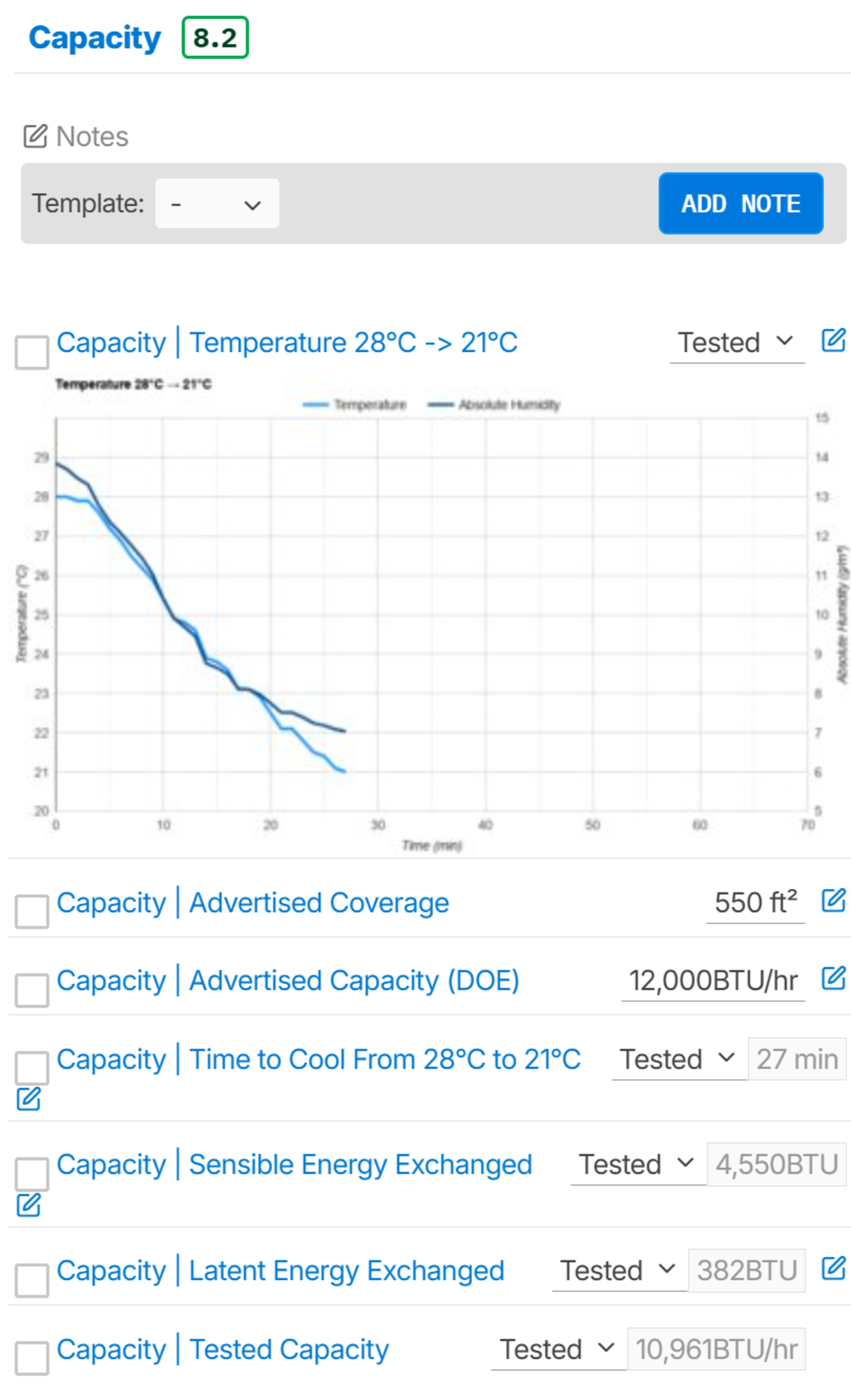 It's worth noting that this unit takes an unusually long time to ramp up to its peak capacity. This phenomenon is magnified when not using the unit's Boost cooling mode, and is visible when tracking both its capacity and efficiency.