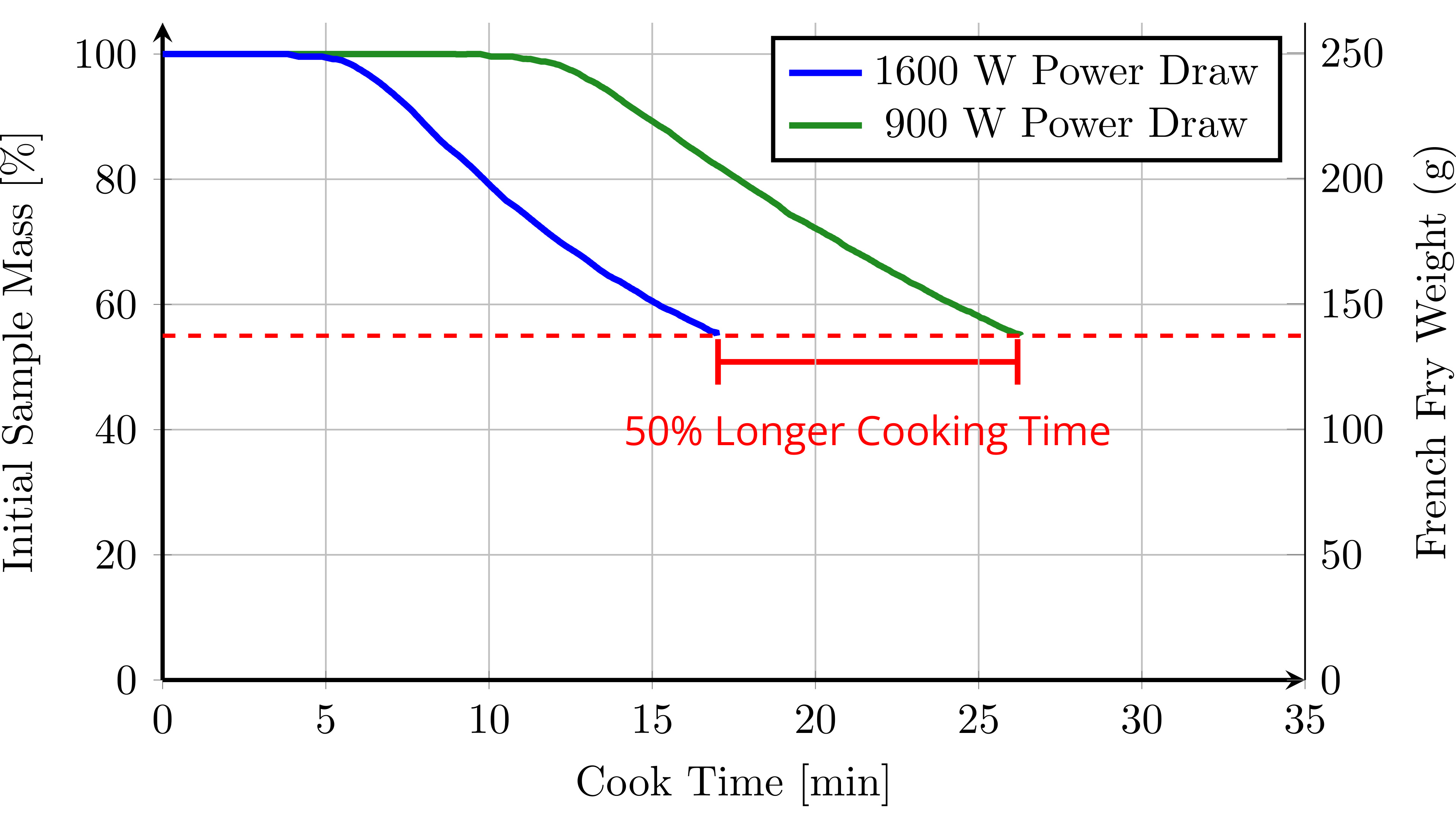 To directly demonstrate the effect of heating element power, we used a variable transformer to reduce the Cosori TurboBlaze's power from 1600 W to 900 W. This lower power meant the preheated TurboBlaze took much longer to recover to its 400°F setpoint after adding frozen fries. As a result, the low-power TurboBlaze required 10 extra minutes to reach the target 45% moisture loss, over 50% longer than at full power: