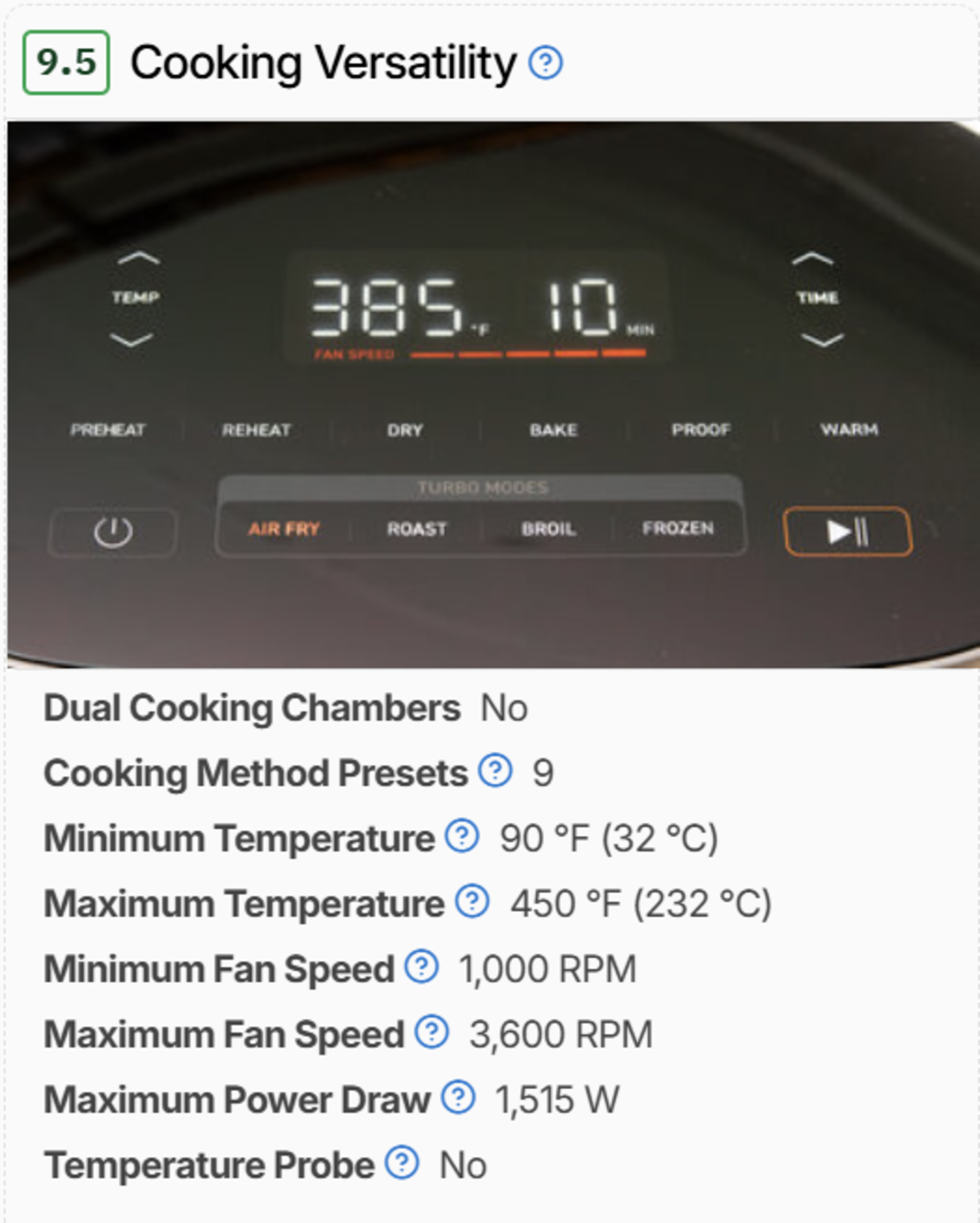 The "Cooking Versatility" box of our air fryer reviews gives information about a model's maximum power draw and its range of fan speeds. -