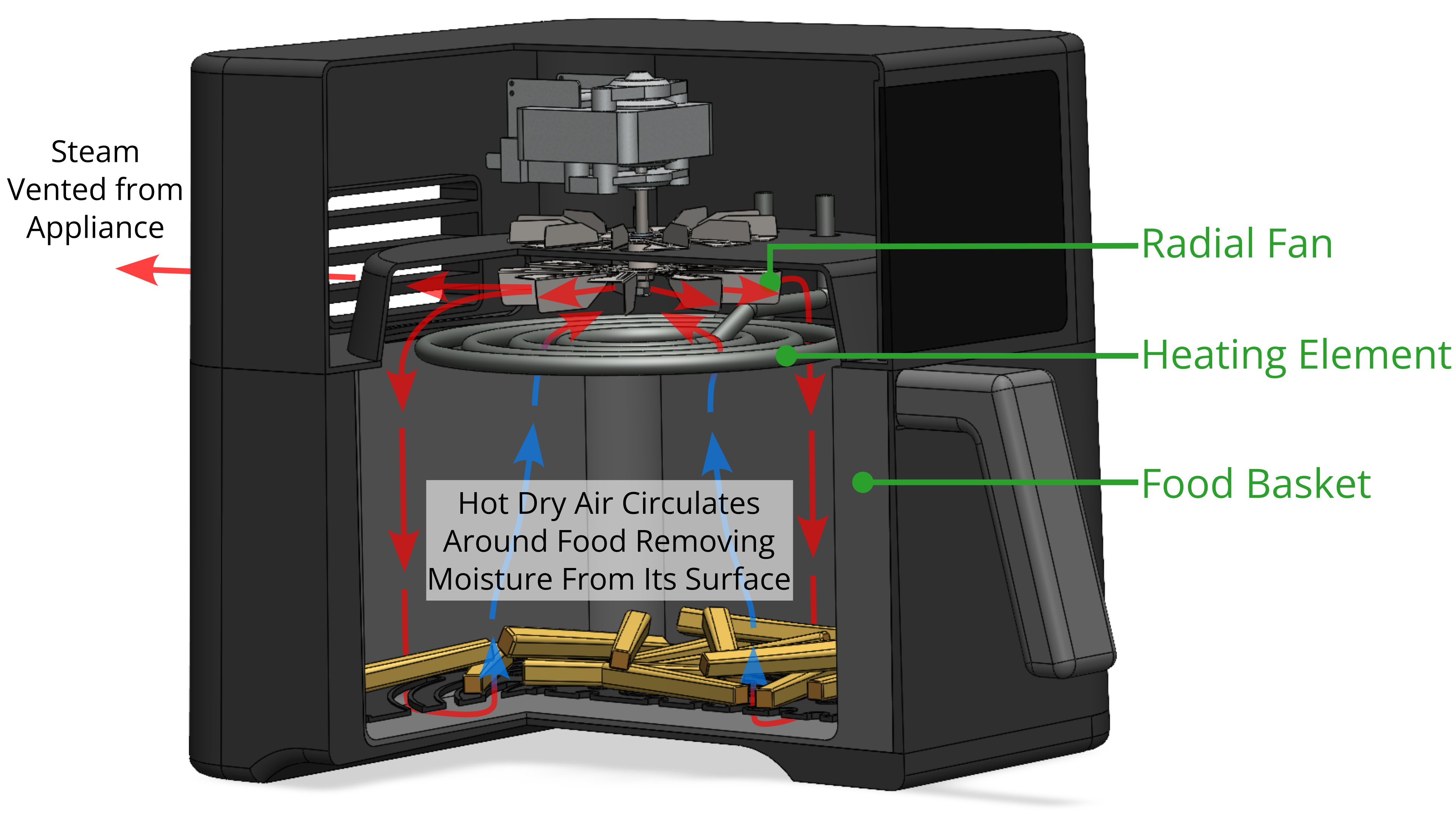 As shown in the rendering below, the fan pulls air up through the heating element and pushes it radially outward. The hot air then travels down the walls of the cooking chamber, circulates under the basket's false bottom, and rises back through the perforations to envelop the food. This airflow carries surface moisture upward, with most of the air recirculating and some venting out the back to remove steam.