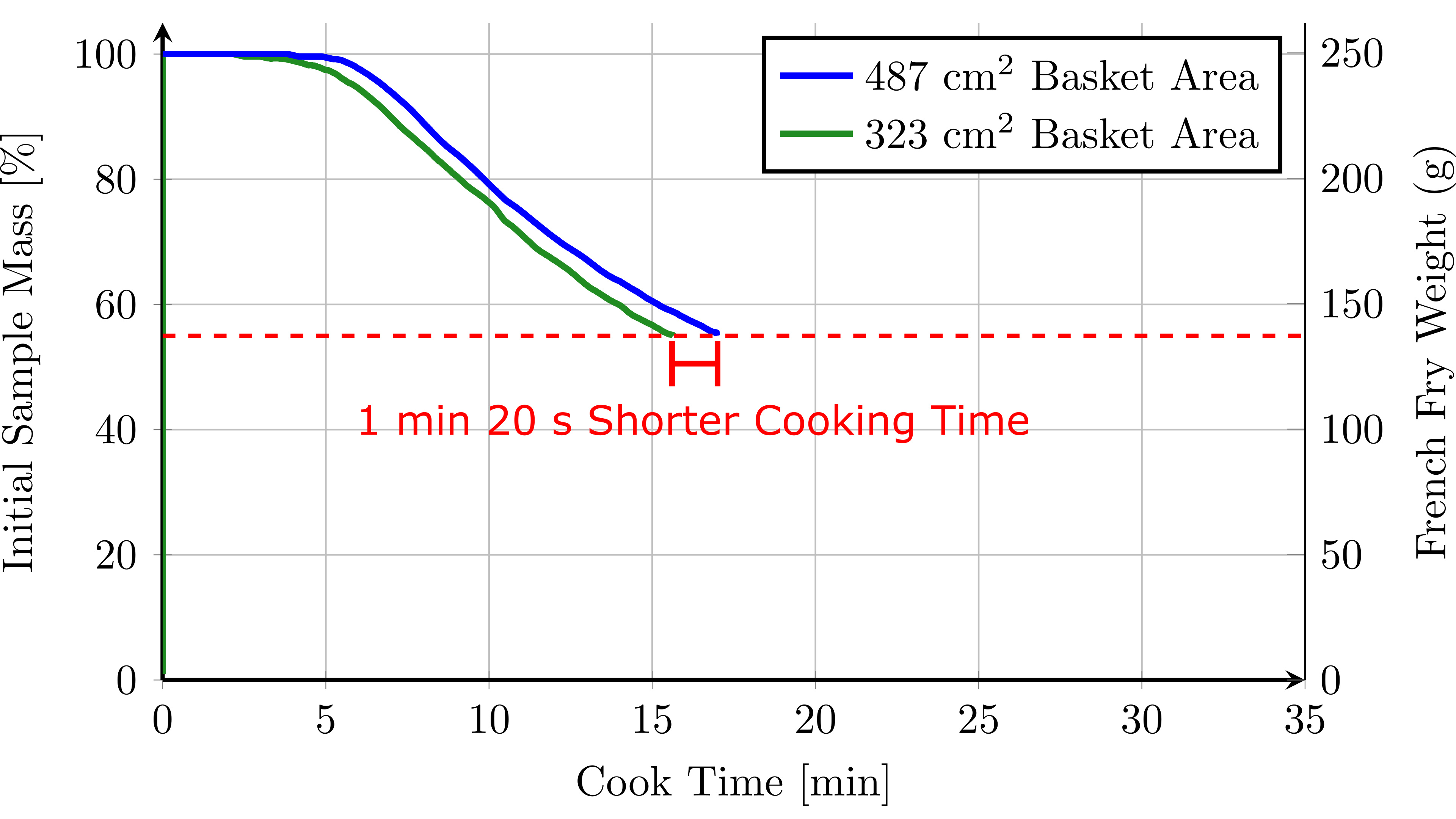 Paradoxically, the smaller basket produced a much higher proportion of overcooked fries. With less bottom surface area in the basket, fries were stacked, limiting airflow to those in the middle of the pile. By the time the pile as a whole reached 45% moisture loss, fries on top were overcooked, while those buried inside were undercooked.