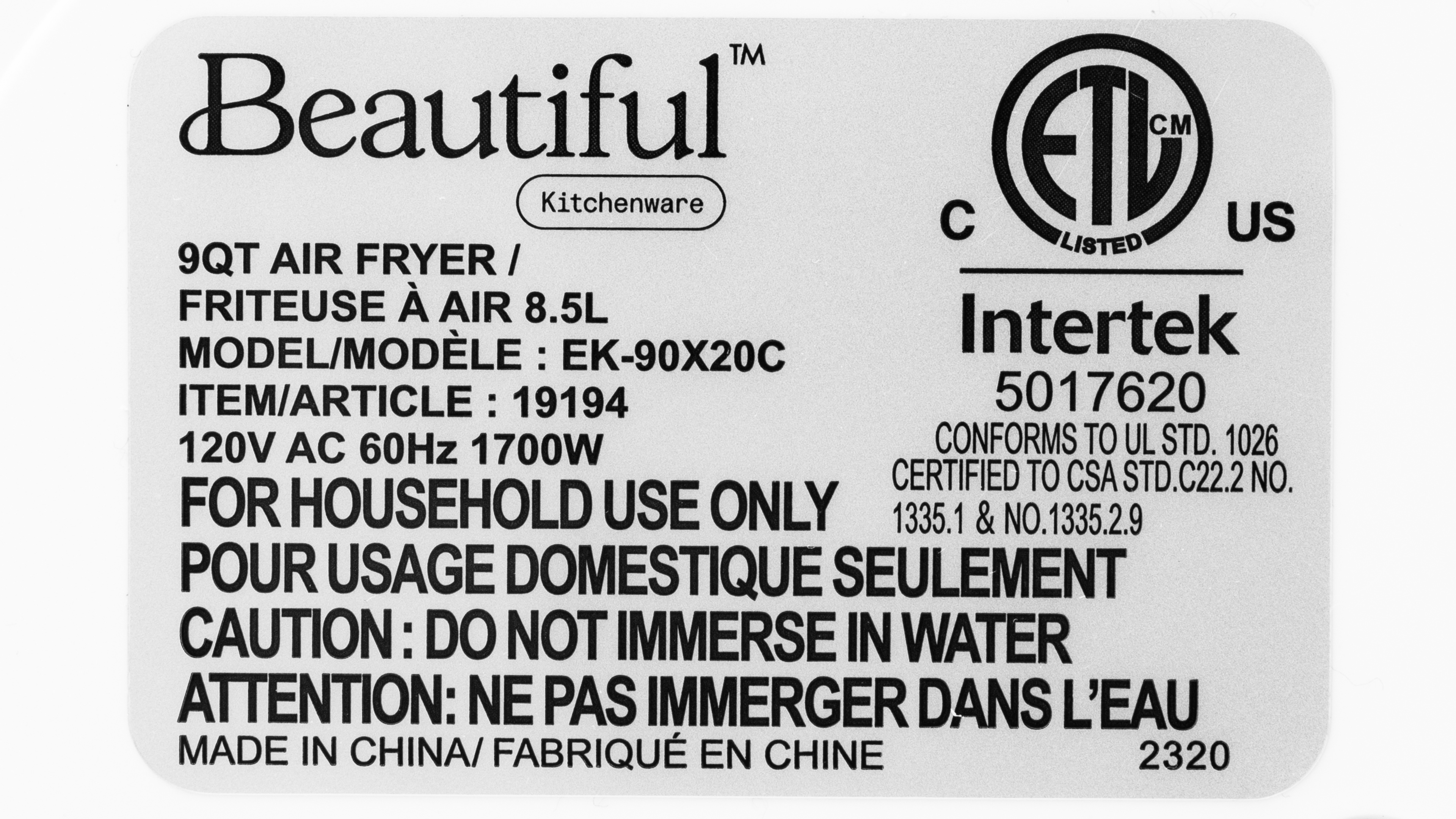 The Beautiful 9QT TriZone air fryer comes in several different colors: 'Black Sesame,' 'Oyster Grey,' 'Sage Green,' 'White Icing,' 'Cornflower Blue,' 'Lavender,' and 'Porcini.' We tested it in 'White Icing, and you can see the label for the unit we tested.