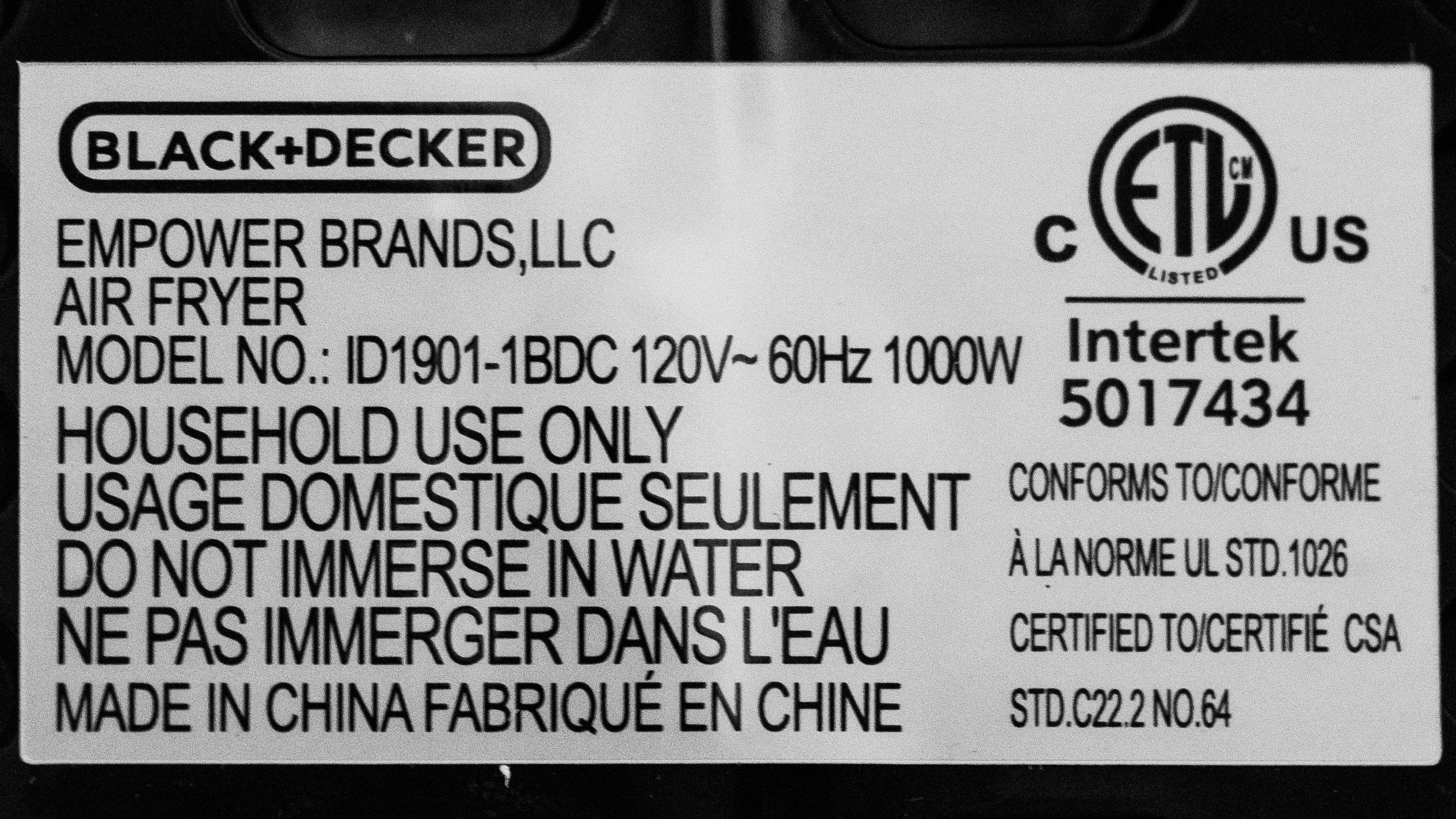 The Black+Decker ID1901-1BDC comes in 'Black,' and you can see the label for our unit.