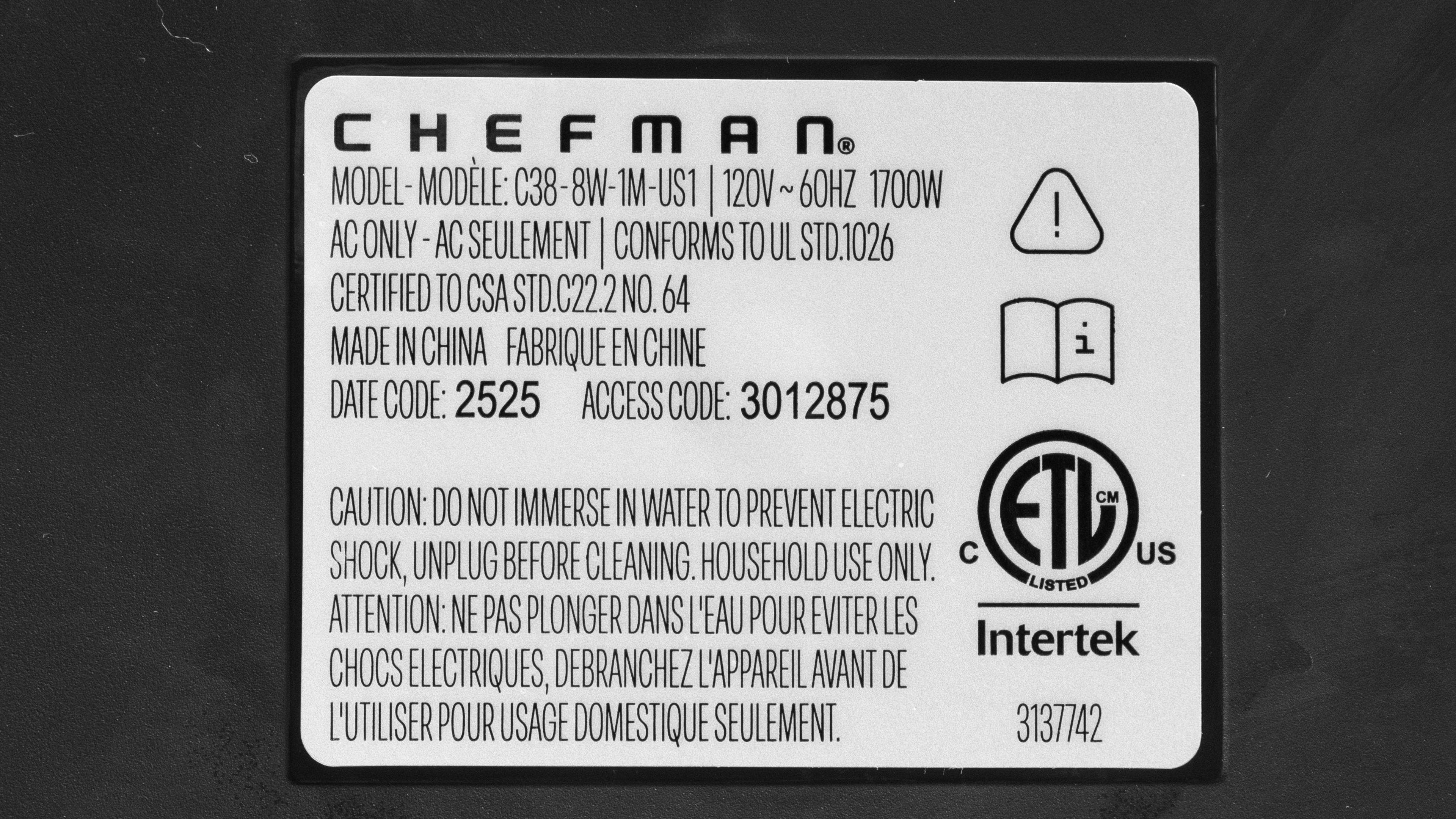 The Chefman Crispinator Air Fryer comes in 'Concrete' and 'Midnight.' There's also a variant with an additional preset cooking mode for frozen items, which Chefman lists simply as the Crispinator 8 Qt. Air Fryer w/ 7 Functions. We tested the Concrete variant with six functions, and you can see the label for our unit.