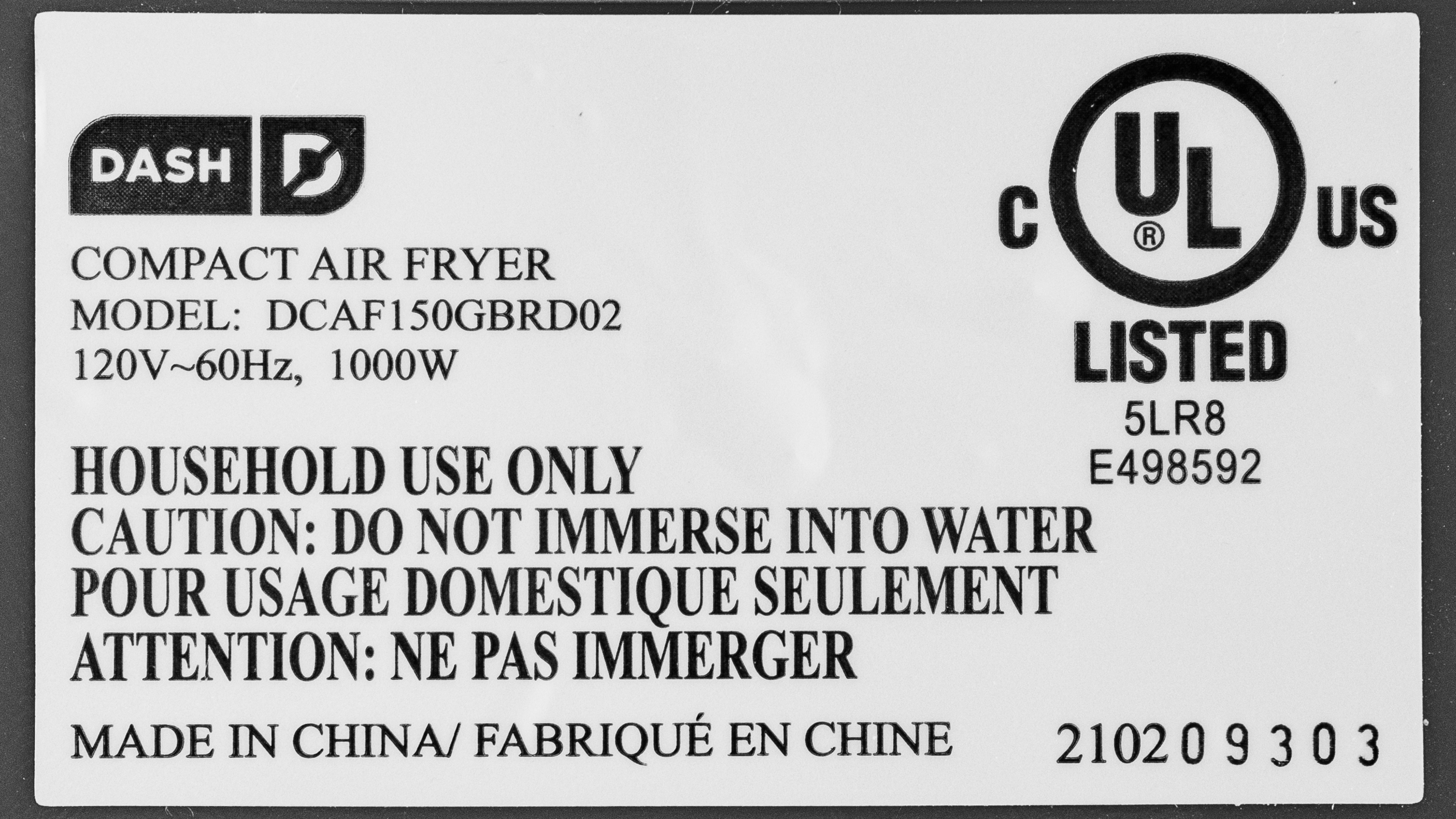 The Dash Compact Air Fryer 2Qt comes in different colors: 'Aqua,' 'Red,' 'Grey,' and 'Black.' Here's a picture of our unit's label.