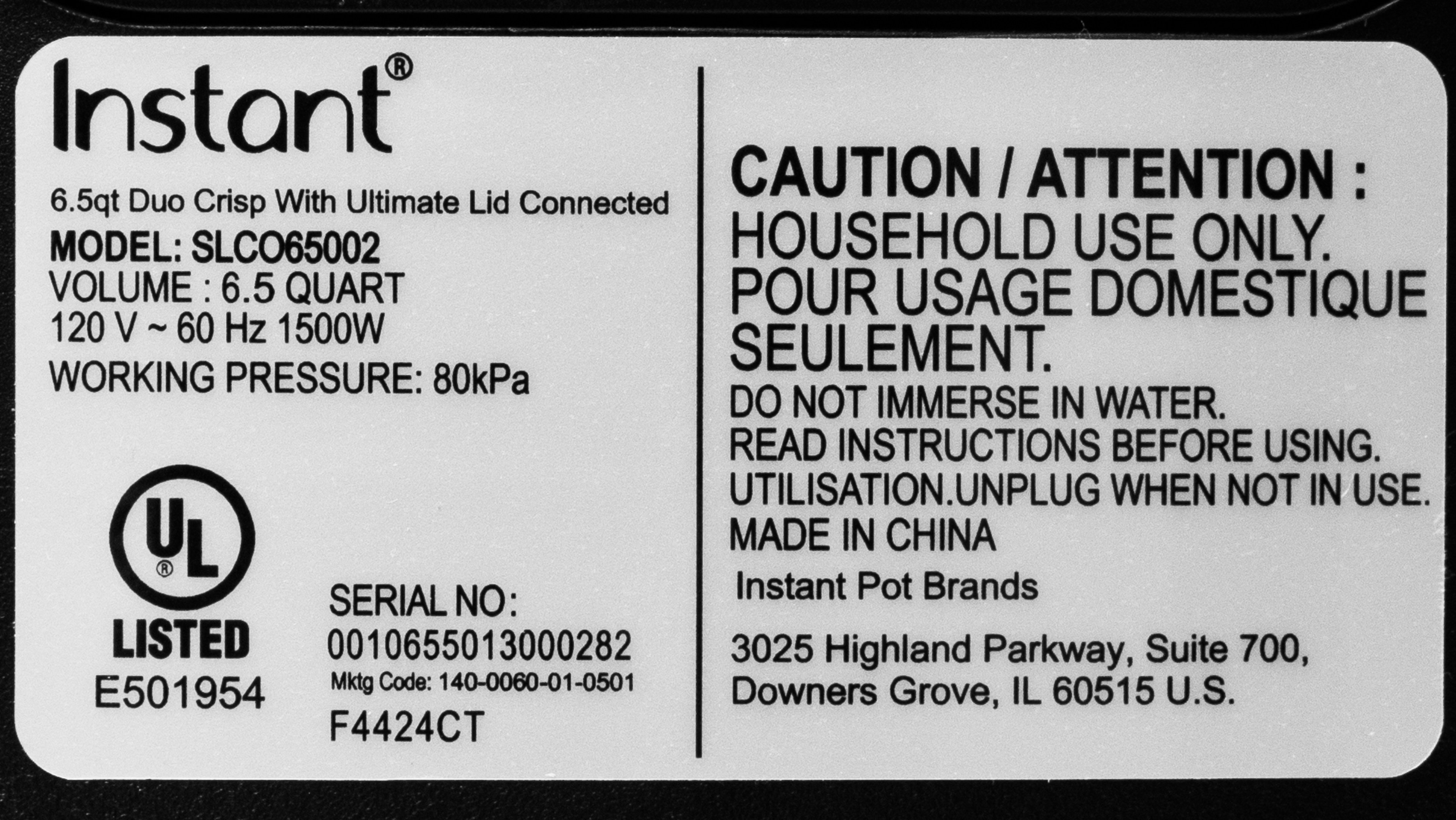 The Instant Pot Duo Crisp 6.5QT is available in 'Black' and comes with or without Wi-Fi connectivity. We tested the Wi-Fi-connected variant, and you can see the label for our unit.