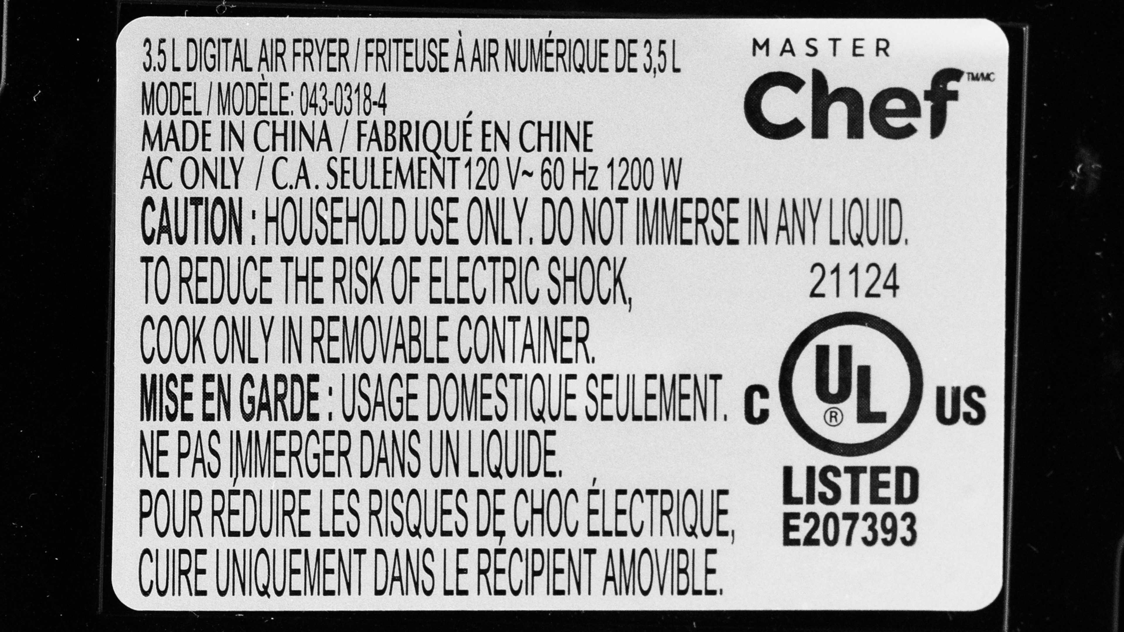 This air fryer comes in 'Black.' Here's the label for our unit.