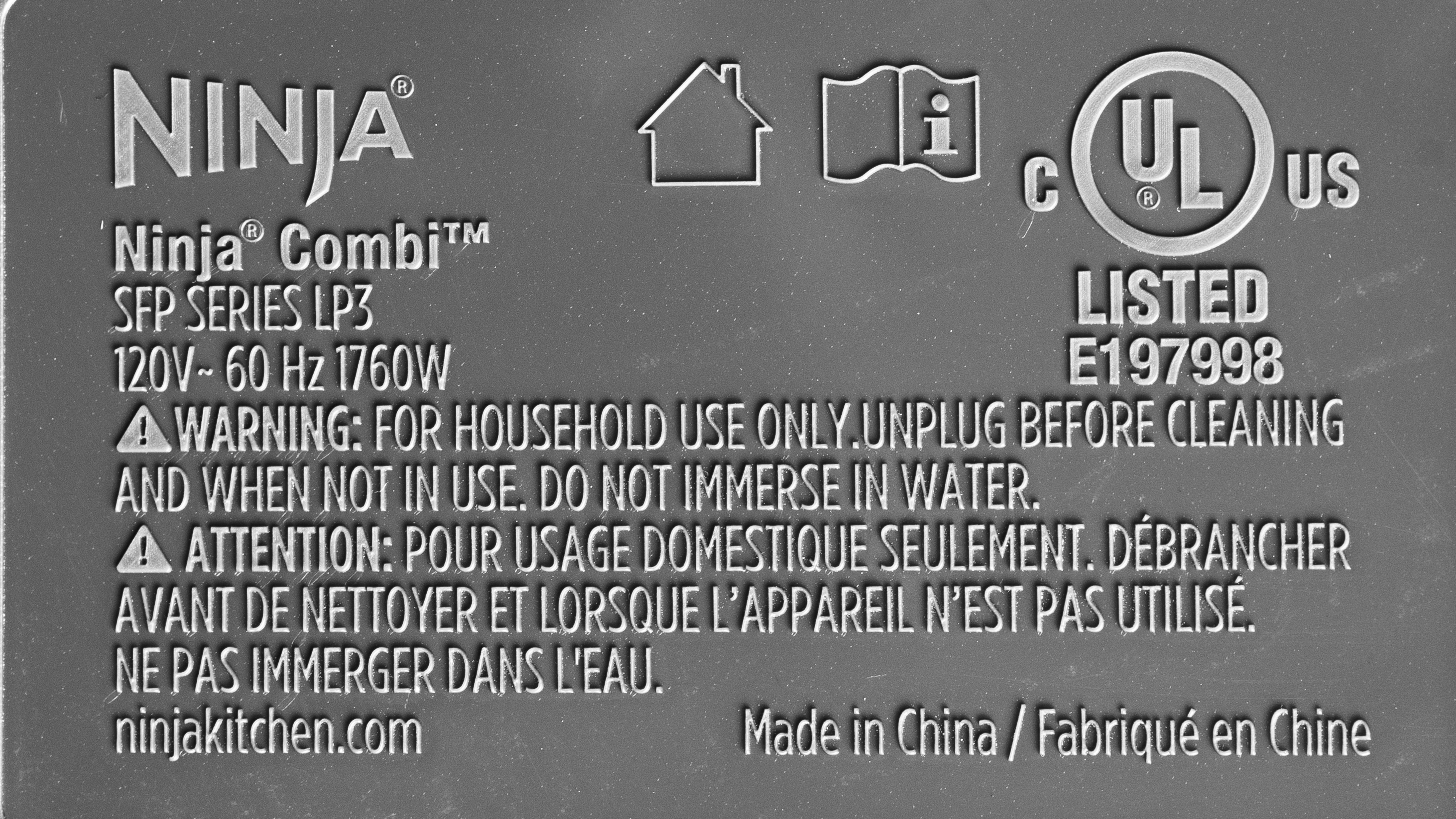 The Ninja Combi All-in-One Multicooker is primarily available in 'Stainless/Black,' and although it also comes in other colors, they're not widely available. Its settings vary slightly depending on where you purchase it, but the cooking modes and construction are the same. We tested the SFP701C variant, and you can see the label and serial number of our model.