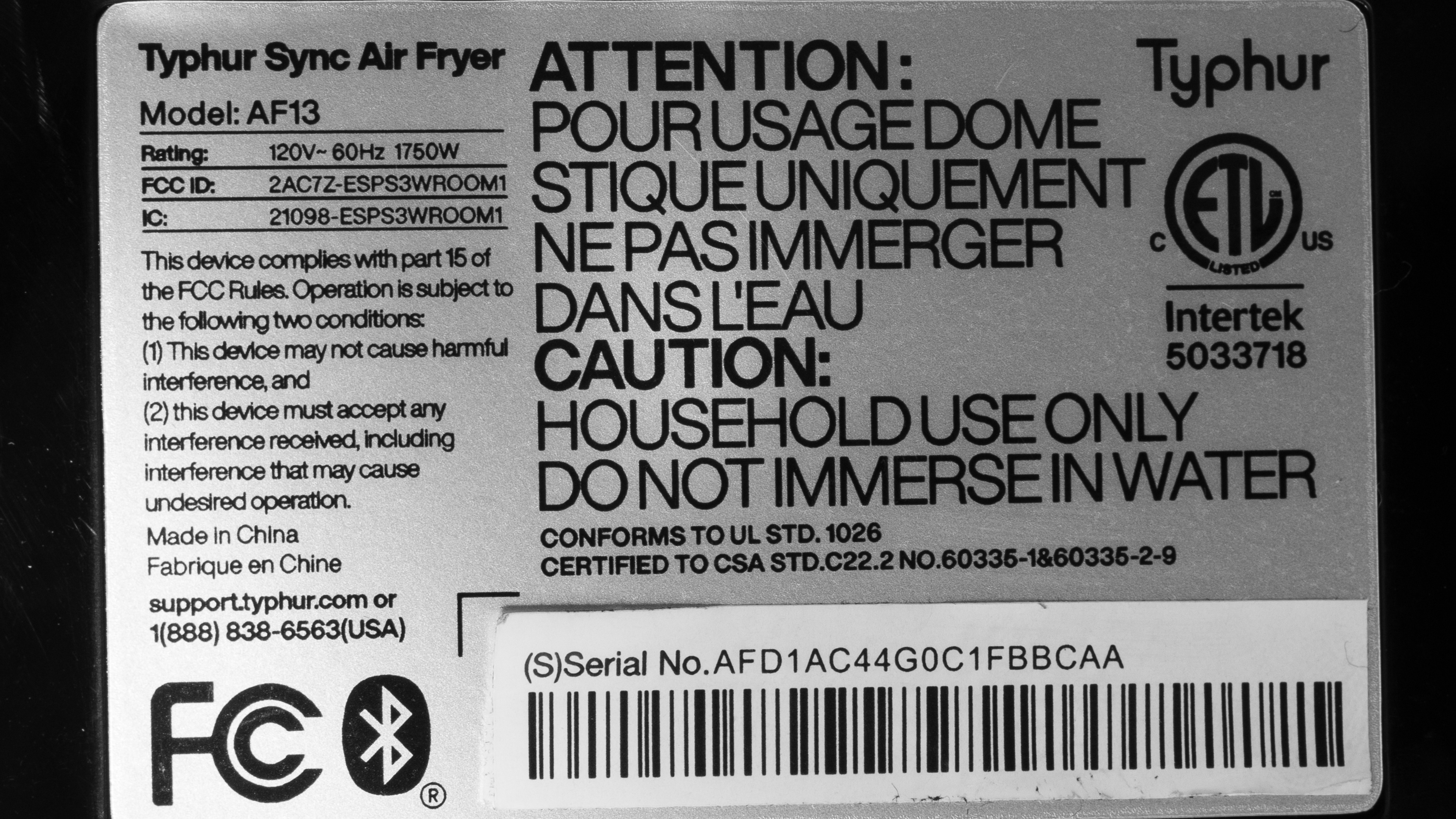 The Typhur Sync Air Fryer comes in 'Black,' and you can see the label for our unit.