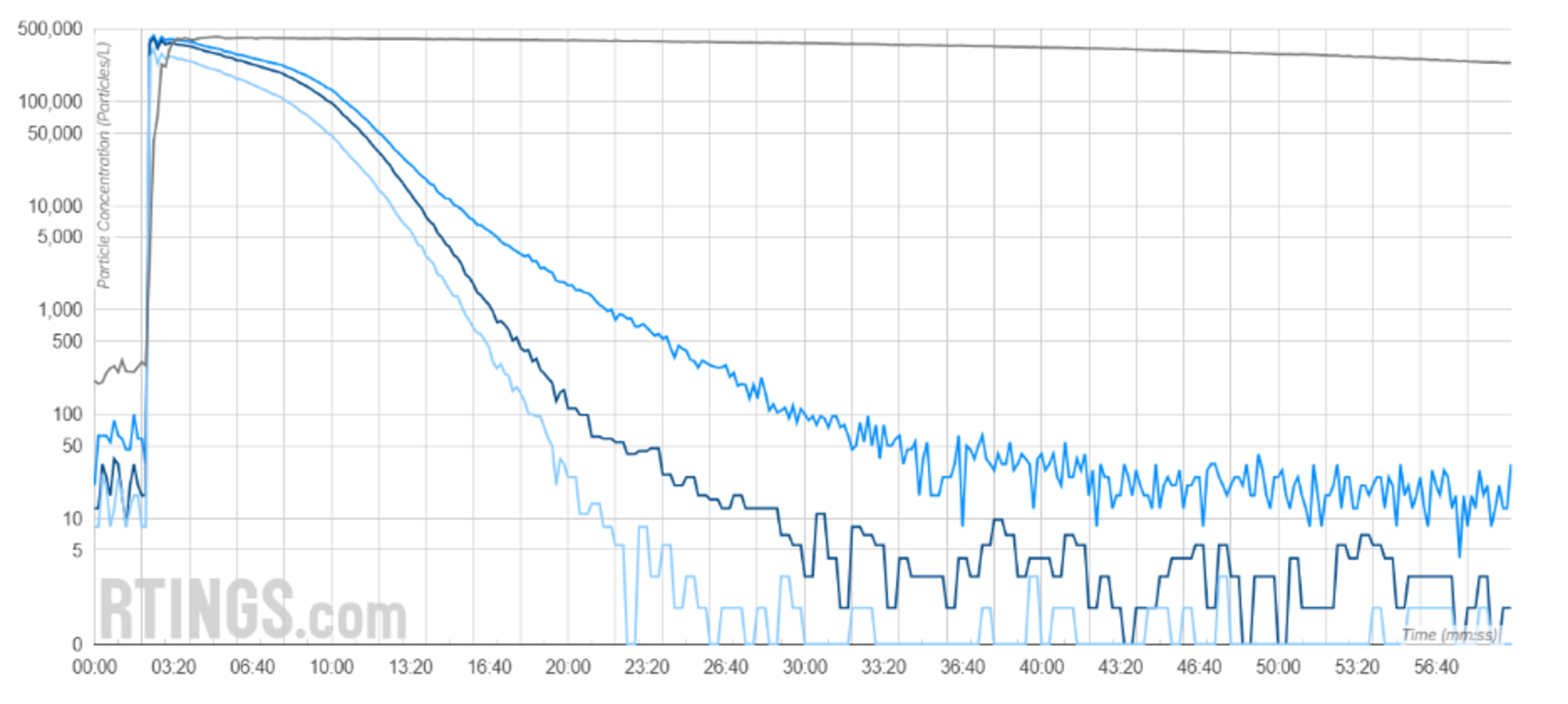 Our new methodology is far stricter. We generate airborne particulate matter by atomizing an aqueous saline solution into our (properly-sealed) testing room. This process generates more uniformly sized particles that are mostly in the 0.3um range, which is considered the most penetrating particle size for any type of filter medium, and tends to bring results significantly closer to AHAM AC-1 figures. We've also shifted the window used to calculate CADR, starting from the point where there's a meaningful drop in particle levels inside our testing room.