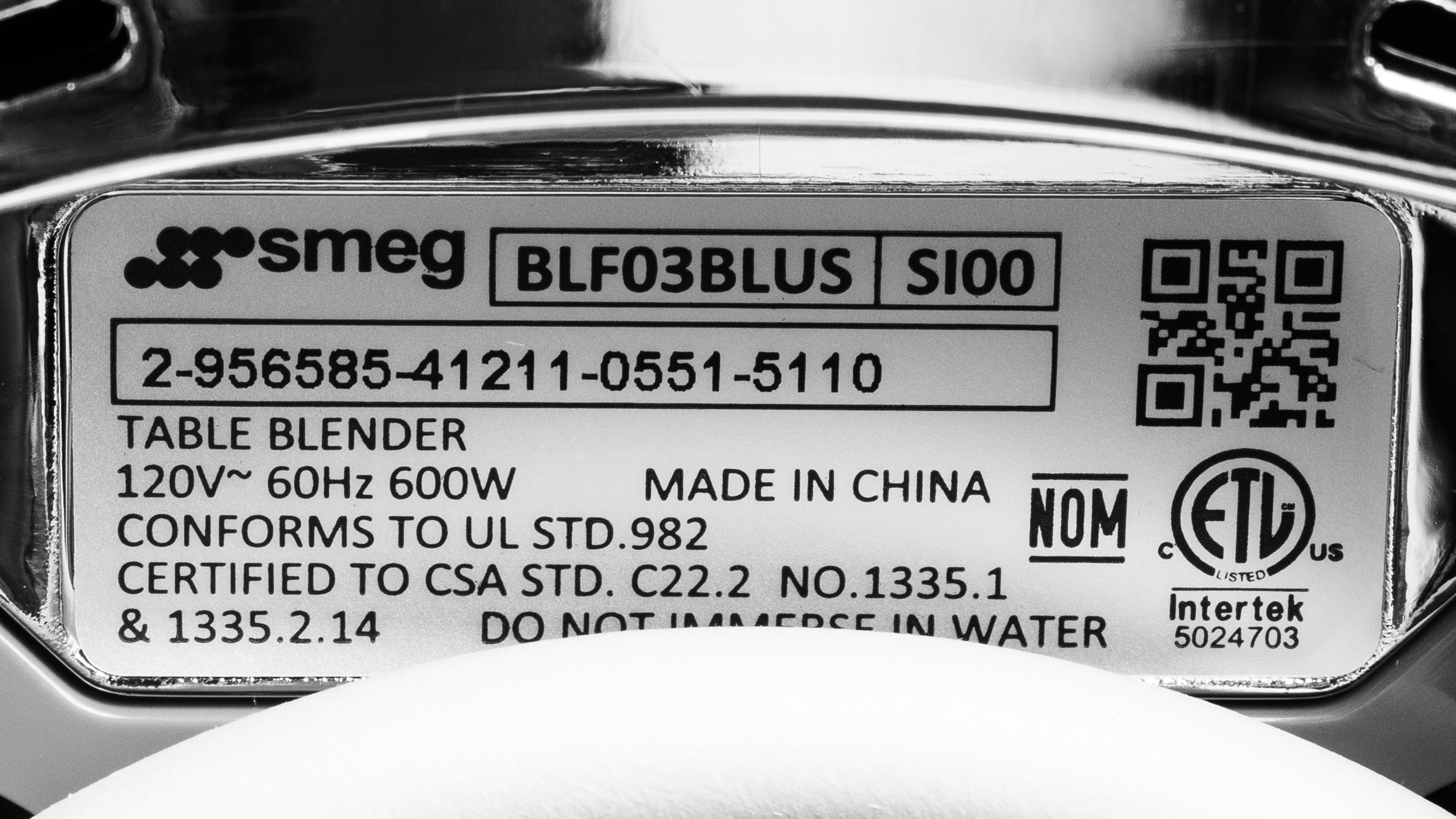 The Smeg BLF03 comes in six colors: ‘Black,’ ‘Pastel Blue,’ ‘Pastel Green,’ ‘Cream,’ ‘Pink,’ and ‘White.’ We bought and tested the ‘Black’ version. There's also a high-end black-and-white variant that's part of the Porsche X Smeg collection (BLF03PCWUS). Here's a photo of our unit's label.