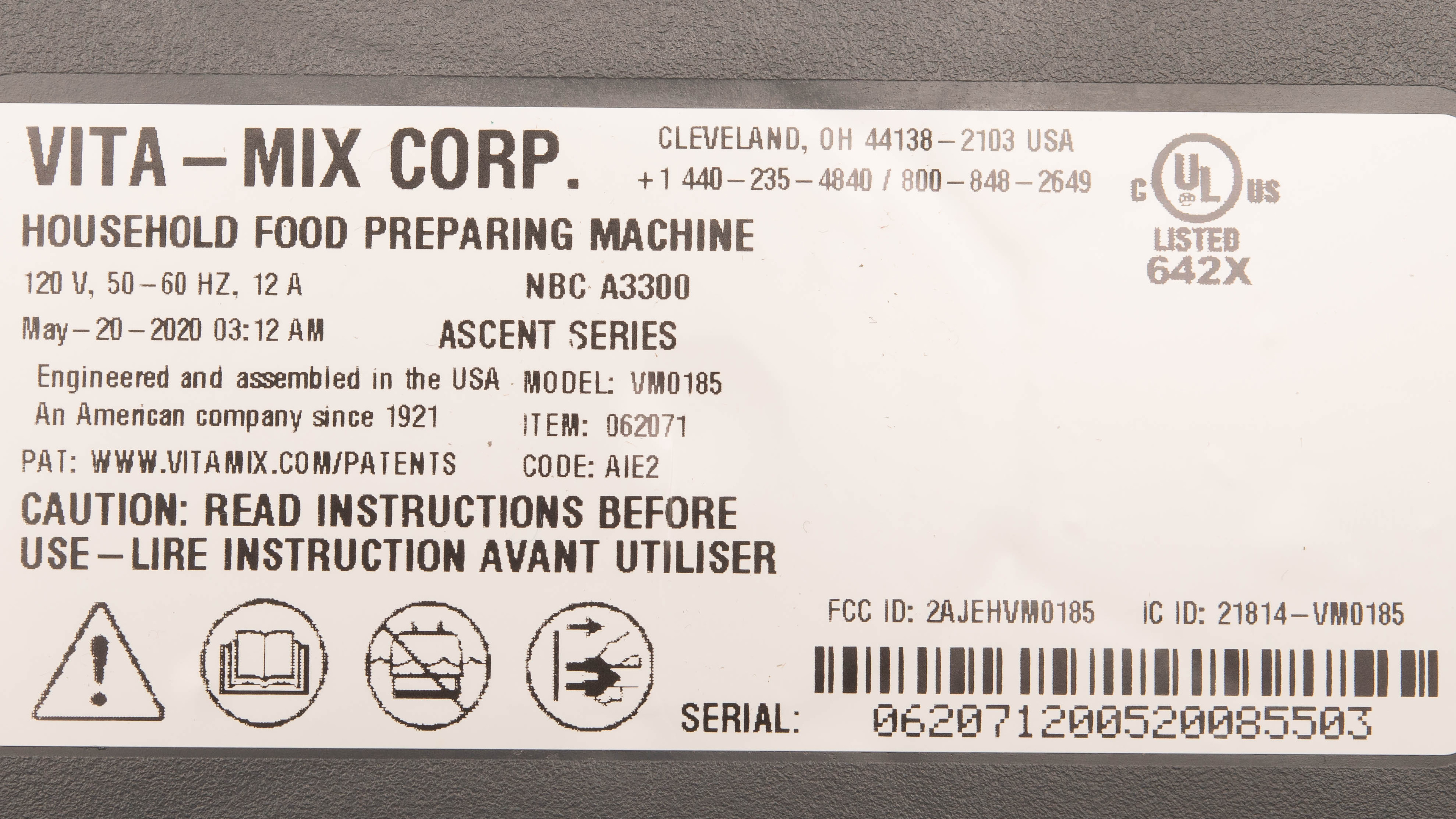 The Vitamix A3300 comes in three color variants: 'Black Diamond', 'Pearl Grey', and 'Brushed Stainless Finish'. We tested the Black Diamond variant, and you can see its label here. We expect all color variants to perform similarly to our model.