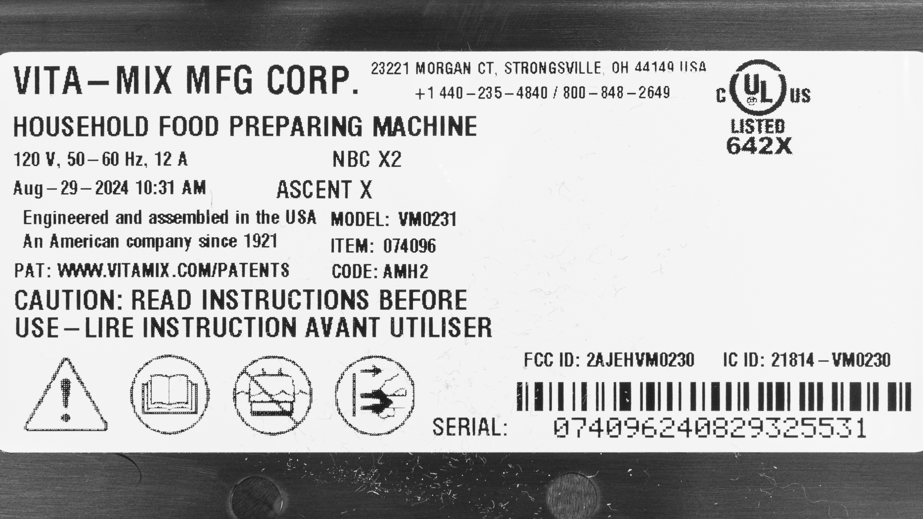 The Vitamix Ascent X2 comes in several different colors. The front control panel is always black, but the rest of the motor base varies in color: 'Midnight Blue,' 'Polar White,' 'Nano Grey,' and 'Shadow Black.' We tested it in 'Midnight Blue.' Here's a photo of our unit's label.