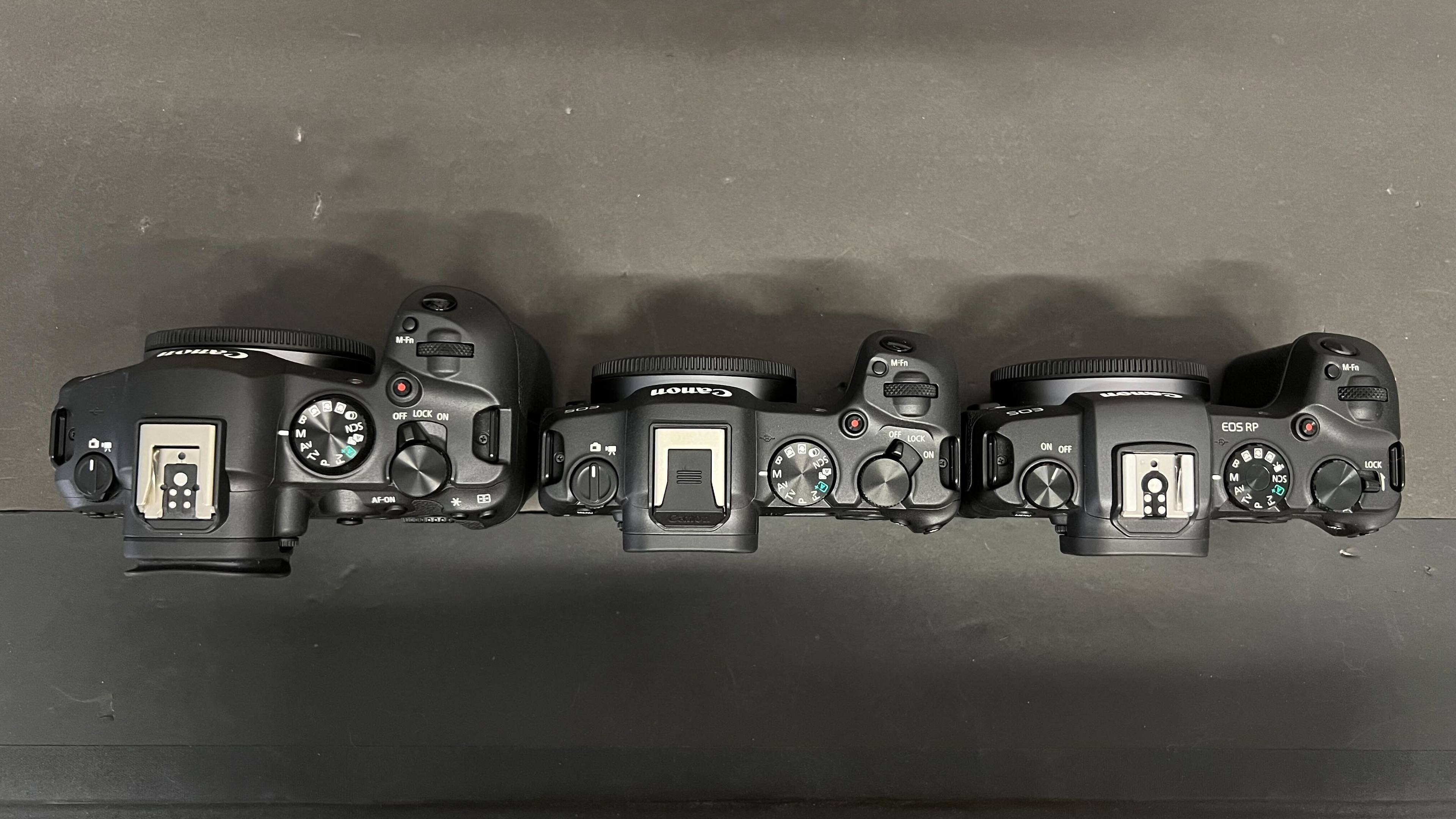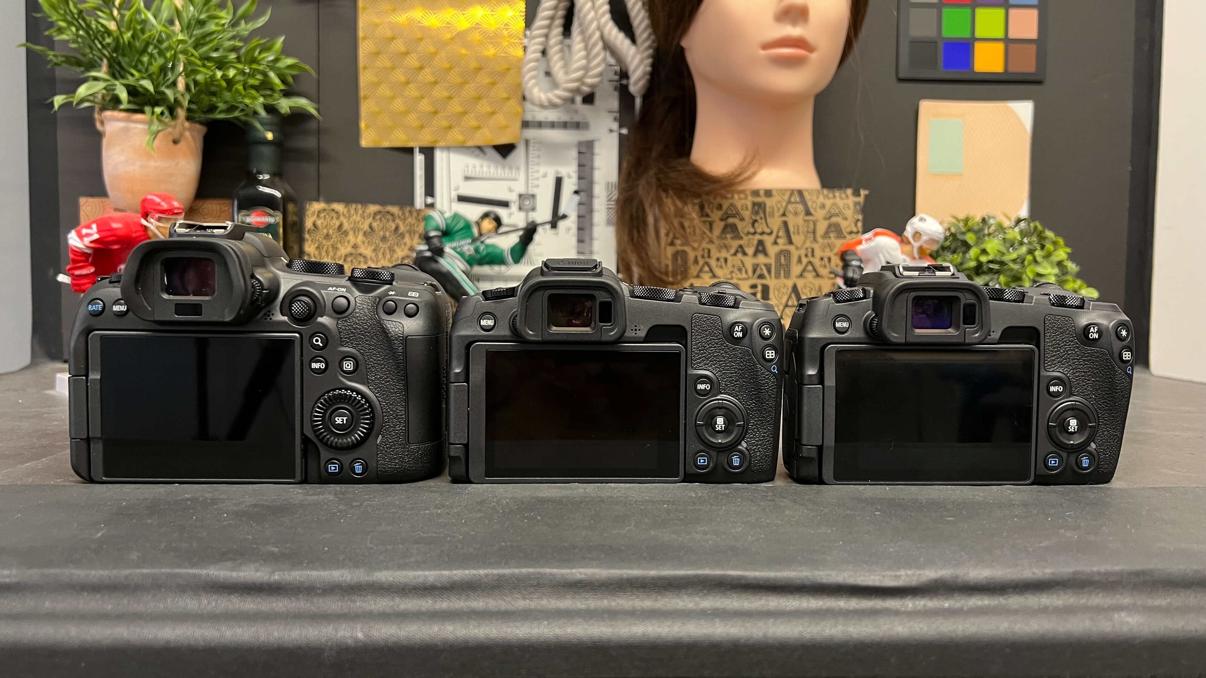 While the R8 is modeled after the Canon EOS RP, it also has some design updates that follow in the footsteps of newer models like the Canon EOS R6 Mark II. For example, there's now a dedicated switch to go from 'Photo' to 'Movie' mode, and the 'Lock' function has been integrated into the On/Off switch. You can see how the R6 II, the R8, and the RP (from left to right) compare from the front, the top, and the back.
