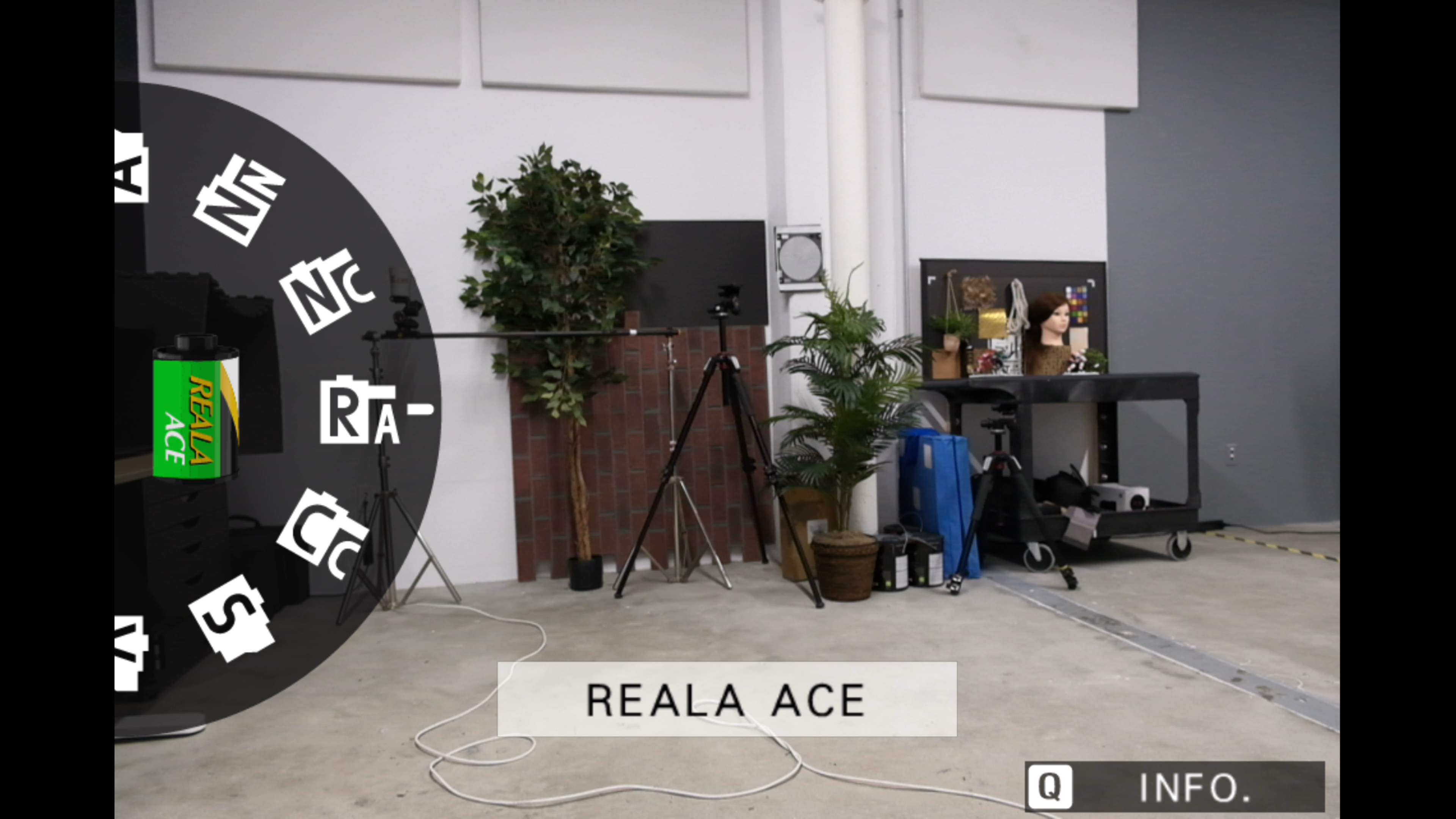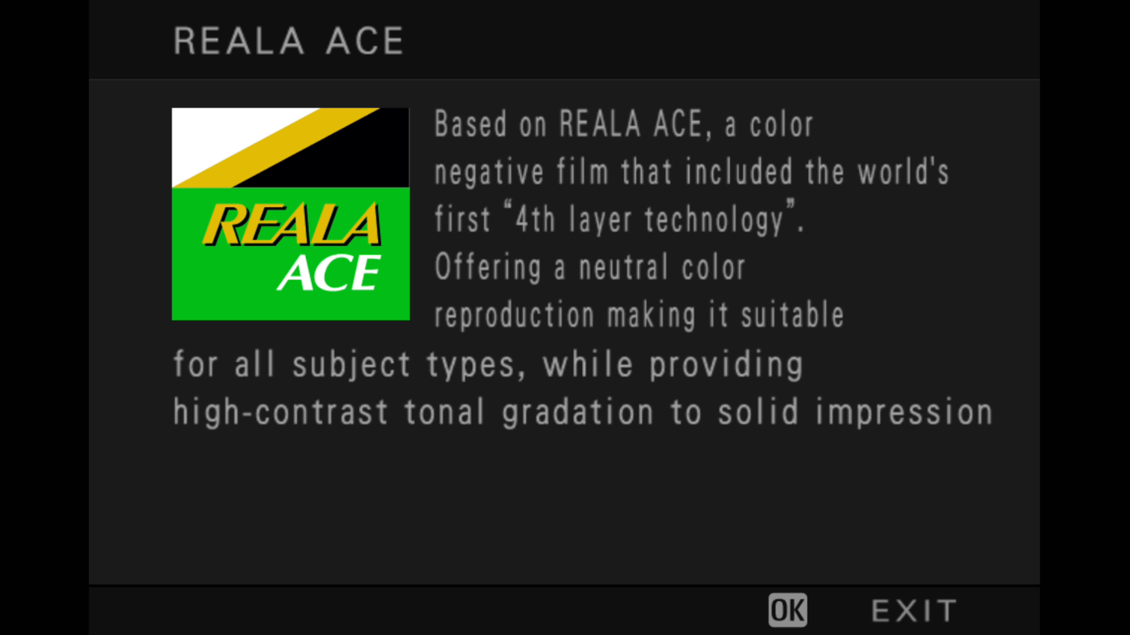 Rather than a drive mode dial, however, the X-T50 includes a dedicated 'Film Simulation' dial, as you can see on the left here. It lets you choose from between eight of the total 20 film sims--including the new Reala Ace profile--as well as up to three custom film sims, and the 'C' setting, which lets you choose from all 20 profiles in the camera menu. You can see which film simulation is active through the viewfinder when you turn the dial, as seen here, and you can get further info, like so when you press the Q button.