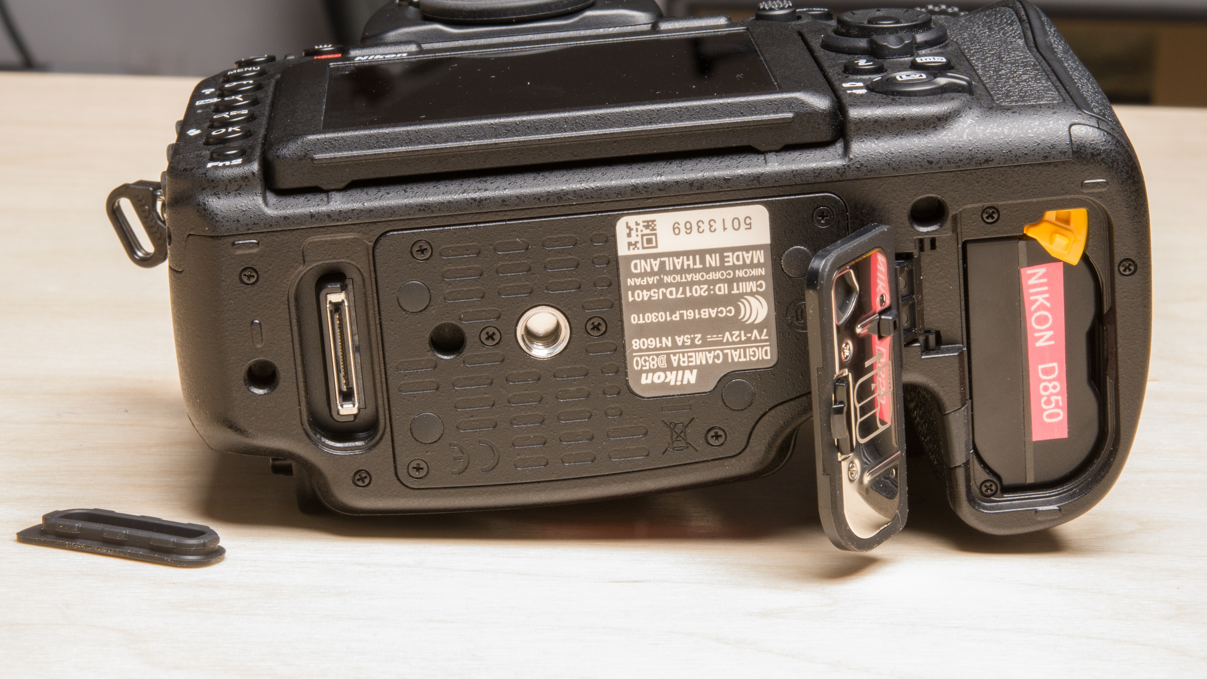 Unlike most cameras, the D850 uses a Micro-B USB port to connect it to a computer for file transfers. There's also a Mini HDMI (Type C) port to connect to an external display, as well as a headphone jack and microphone input. Additionally, there's a battery grip connector on the bottom and sync ports on the front shoulder of the camera. The camera also supports both Bluetooth and Wi-Fi for wireless connectivity.