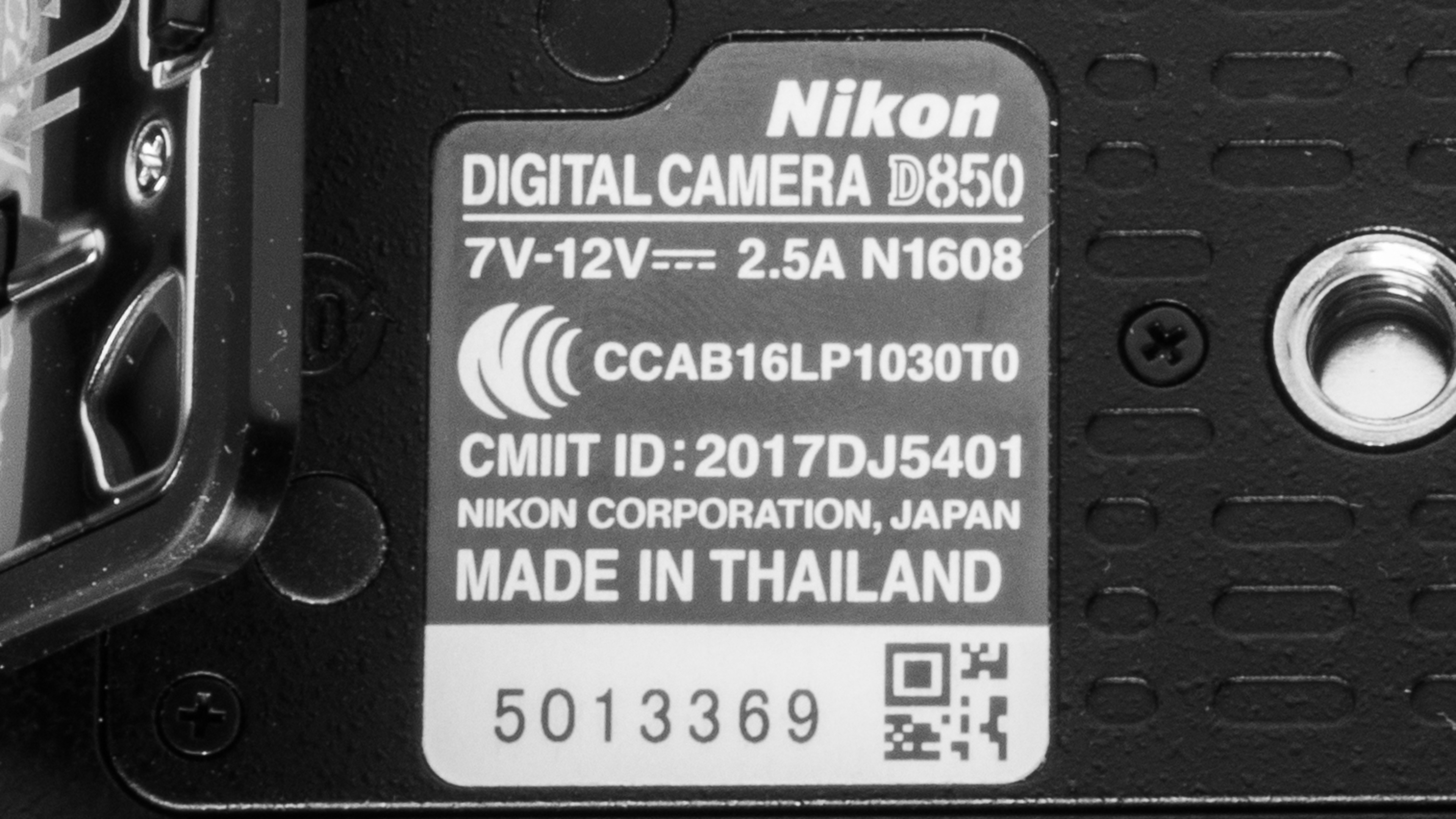 The Nikon D850 comes in one color: Black. Here's a picture of our unit's label.