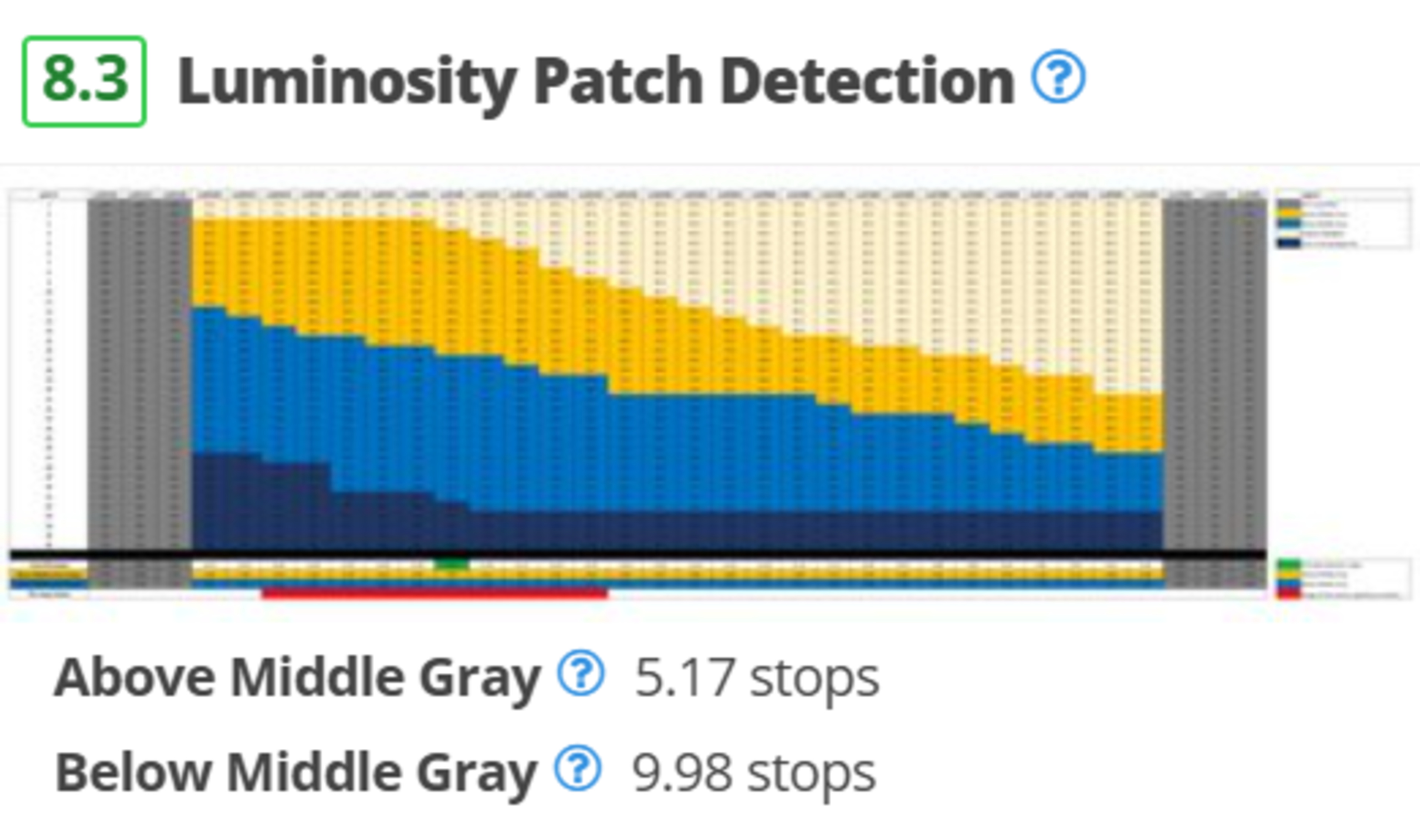 The Luminosity Patch Detection test complements the Video Dynamic Range test. This test measures the maximum number of stops the camera can capture in the highlights (above middle gray) and the shadows (below middle gray) across its entire ISO range. While the Video Dynamic Range test takes noise into account, the Luminosity Patch Detection test does not.