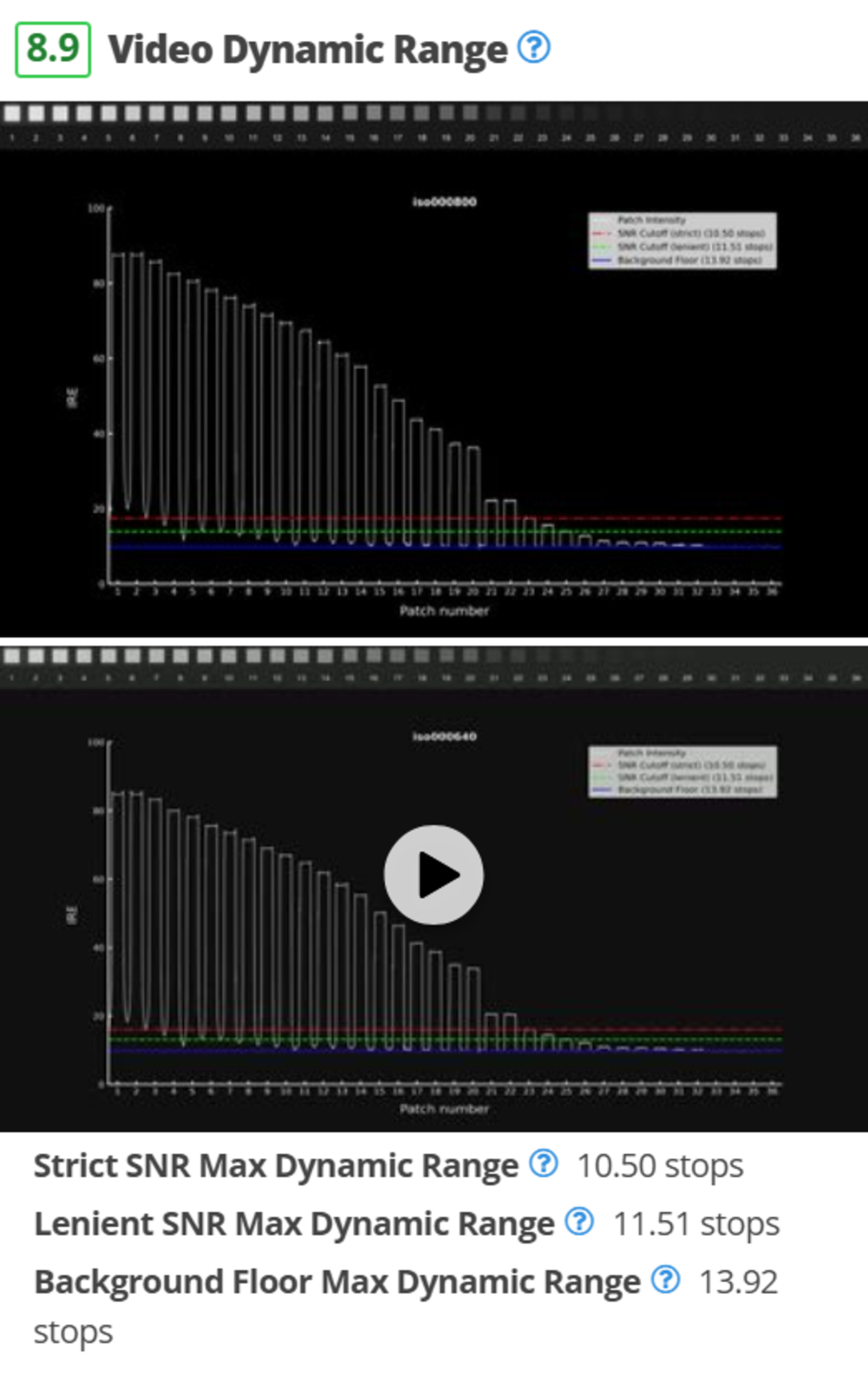 The test consists of a waveform showing the full dynamic range of a camera, a slideshow to show the dynamic range at every ISO setting, and three dynamic range values based on different noise thresholds. You can read our R&D article to learn more about our testing and how sensor hardware, noise, and Log gamma curves all play a role in getting the most video dynamic range out of a camera.