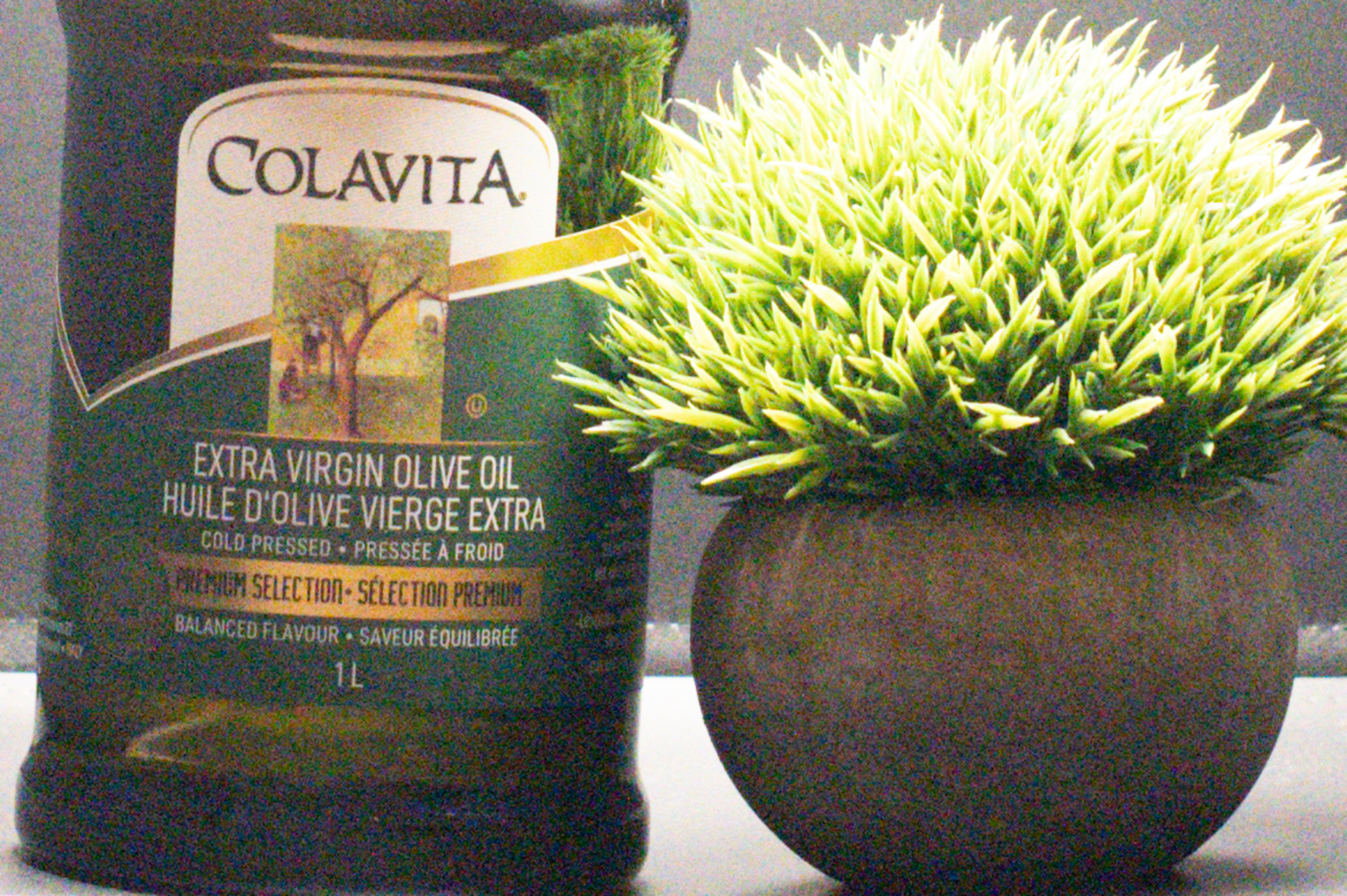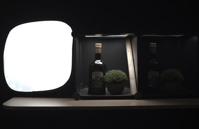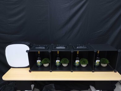 To visually represent these differences in performance, we capture an image of a test scene. For the scene, we set up a series of light boxes, each with an olive oil bottle and a small fake plant, next to a light diffused by a softbox.
