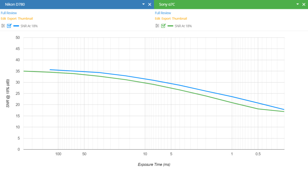To illustrate, let's compare the Nikon D780 and the Sony α7C using our Noise vs Exposure Time graph.