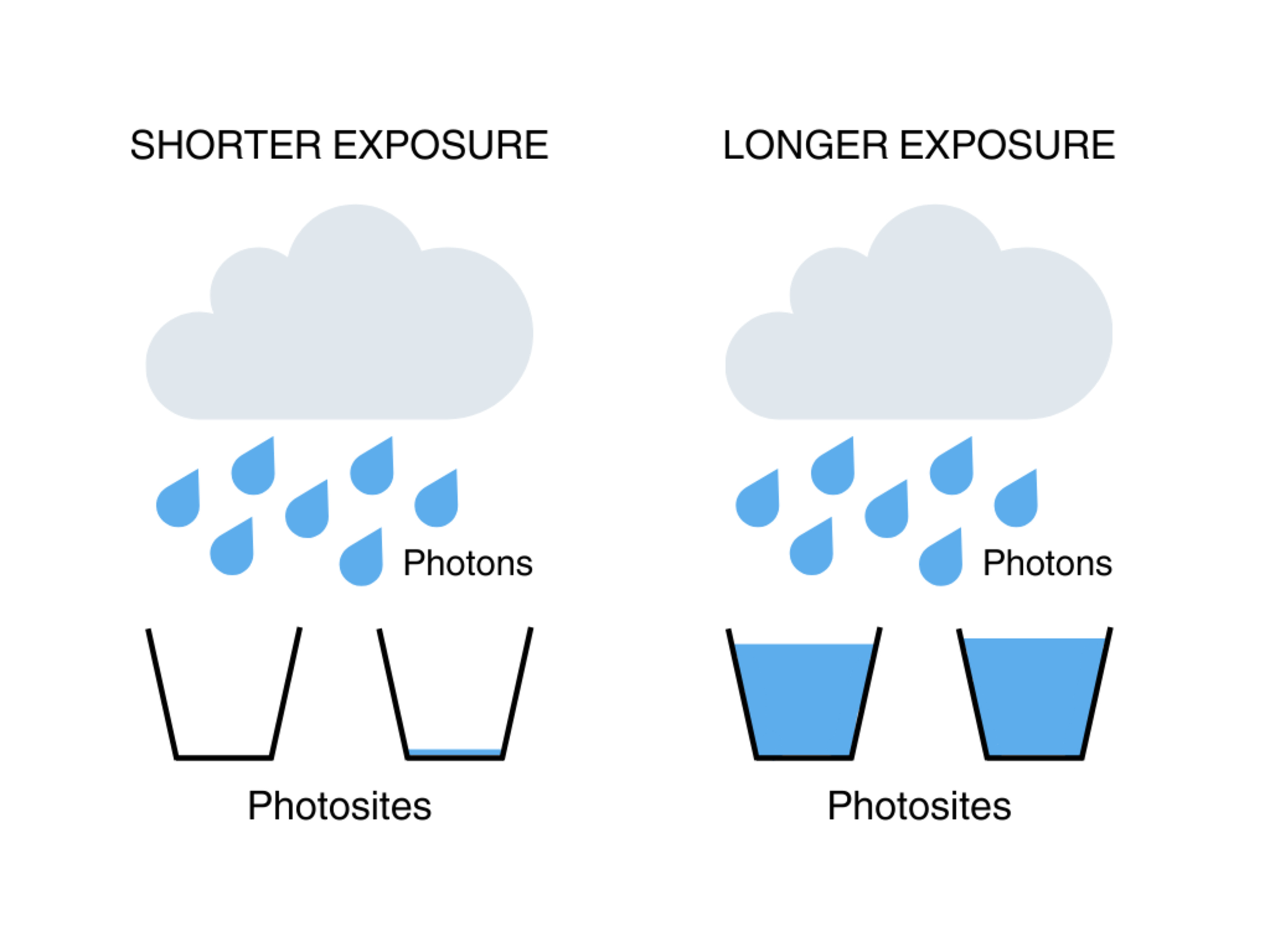A common way to think about shot noise is to imagine the sensor photosites as buckets and photons as raindrops. If you expose the buckets to rain for a very brief period, the differences in the rain captured by each bucket will be much clearer—some buckets might be totally empty, while others might have a few drops, making the relative difference between them larger. But leave the buckets exposed for longer, capturing a greater number of total raindrops, and the average difference in raindrops becomes much less noticeable.