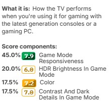 We could just have test results in our reviews, with no scores, but there are a few downsides to that approach. Understanding the core principle of a test and understanding how to interpret the individual measurements are two very different things. You might understand what input lag is, without necessarily knowing what the difference between 8ms and 16ms actually represents. One goal of our scoring system is to provide additional context in a simple, easy-to-understand format that even people without prior knowledge of a product category can understand.