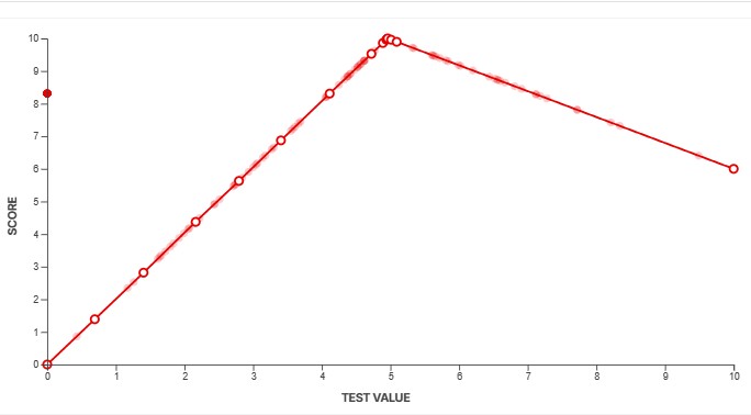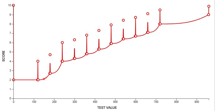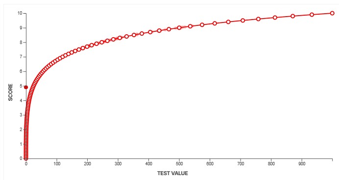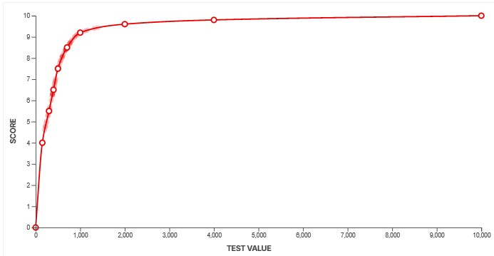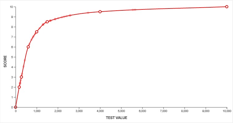 To convert our measurements into scores, we use a feature called a scoring spline. When creating a new test, we define the scoring curve at the same time to ensure our scores align with the scoring guidelines outlined above. We need to know what a good value looks like and how noticeable anything above and below that measurement would be. This defines the overall slope at certain points along the curve. For example, some aspects of a product's performance might yield diminishing returns beyond a certain point. We can adjust the curves to make sure that's accounted for. Other aspects might have a more linear slope, depending on how a change in performance impacts the end user.