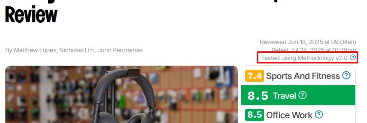 A specific combination of tests, scores, and ratings is grouped together in a specific test bench version, which you can see at the top right of any review just under the title. This version number makes it easy for you to identify exactly how we tested a product, and it works similarly to the way most software is released. As we revise our test bench, we'll update the version number based on the scope of the update. A minor update might change only the last digit, whereas a major update might change the first digit, like when we went from version 1.8 to version 2.0 on Headphones.