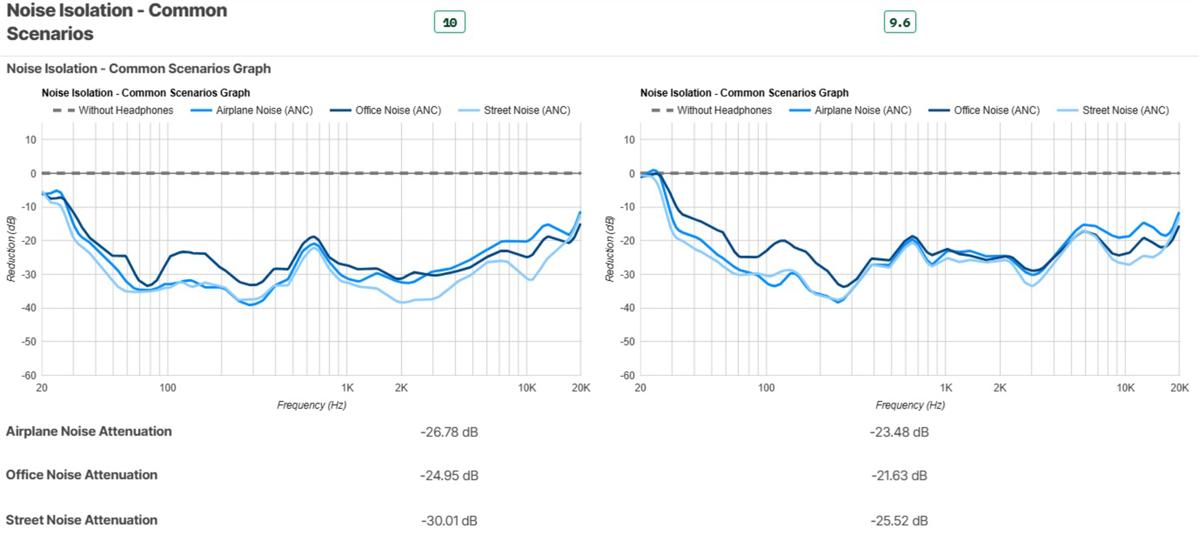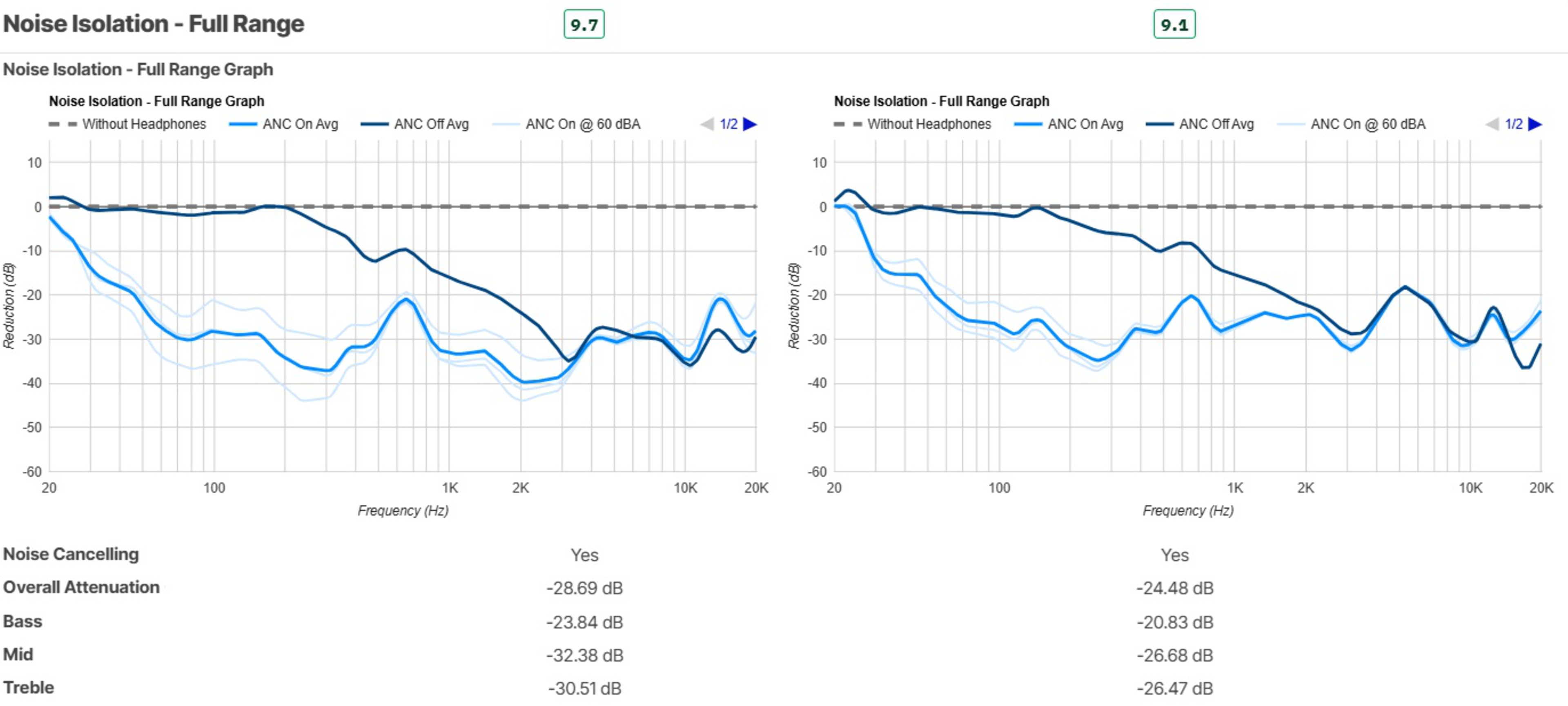 Overall, the AirPods Pro 3 exhibit superior noise isolation. The AirPods Pro 2 are still competitive against most ANC-equipped earbuds on the market, but the successor blocks even more noise. Those hybrid silicone-and-foam ear tips and the slightly deeper in-ear fit are effective at preventing high-pitched frequencies from reaching your ears. As mentioned already, those ear tips on the Pro 3 are a bit more delicate, which means over time, the earbuds' ability to block out high-pitched frequencies may deteriorate. We measured a comparison between new ear tips and the ear tips we'd been using during our rigorous testing process, and we found that high frequencies are less effectively attenuated by the used ear tips. Similarly, caring for your AirPods by cleaning them and keeping the mics and vents free of debris helps with their ANC performance.