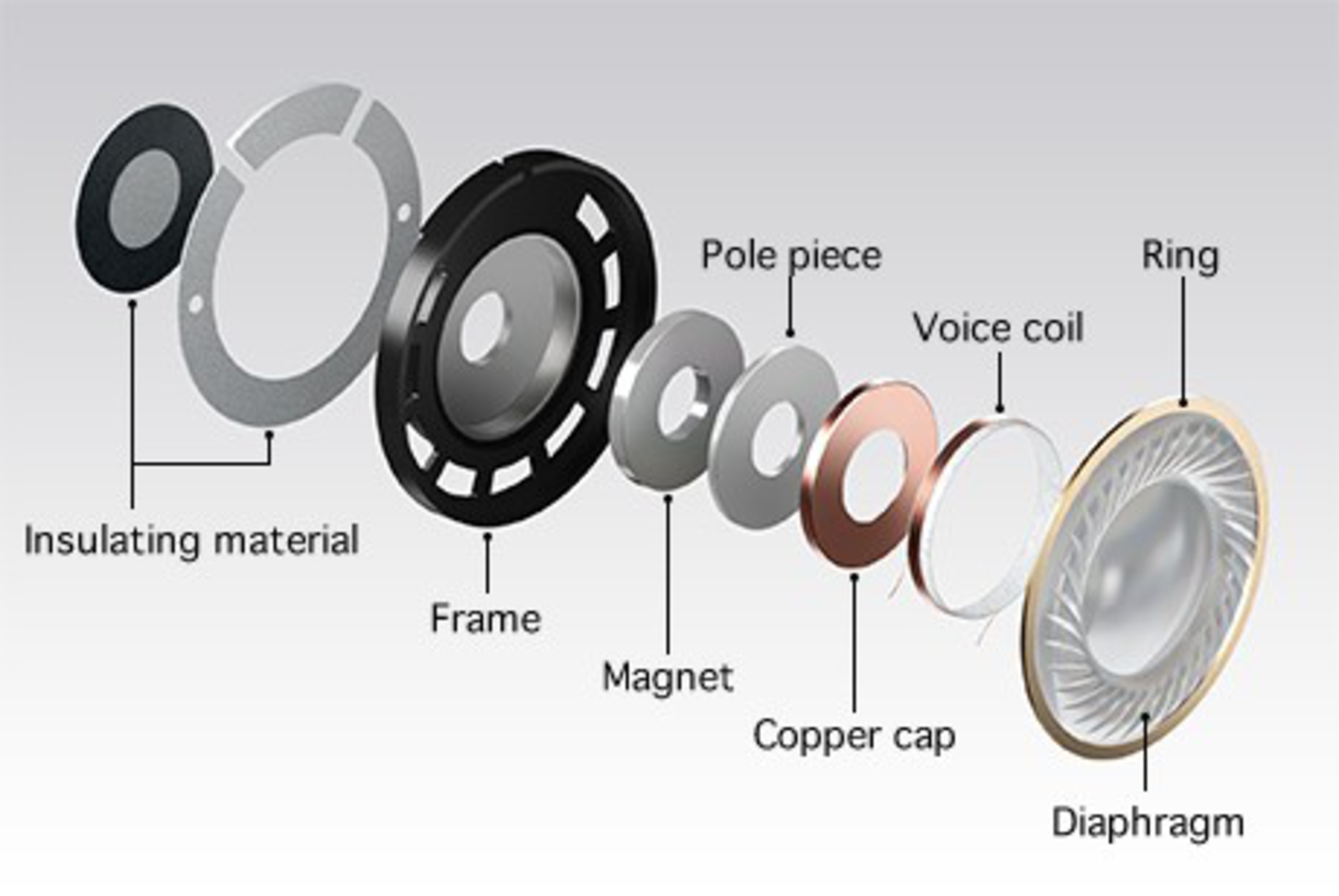 Dynamic drivers (also called moving-coil drivers) operate much like miniature loudspeakers. They have a dome or cone-shaped diaphragm attached to a voice coil of wire. This coil sits in front of a magnet. When an audio signal (electric current) passes through the coil, it creates a magnetic field that moves the coil back and forth in the magnet's field. The coil's motion pushes and pulls the diaphragm, vibrating the air to create sound waves. This simple design has been used for nearly a century in headphones and speakers.
