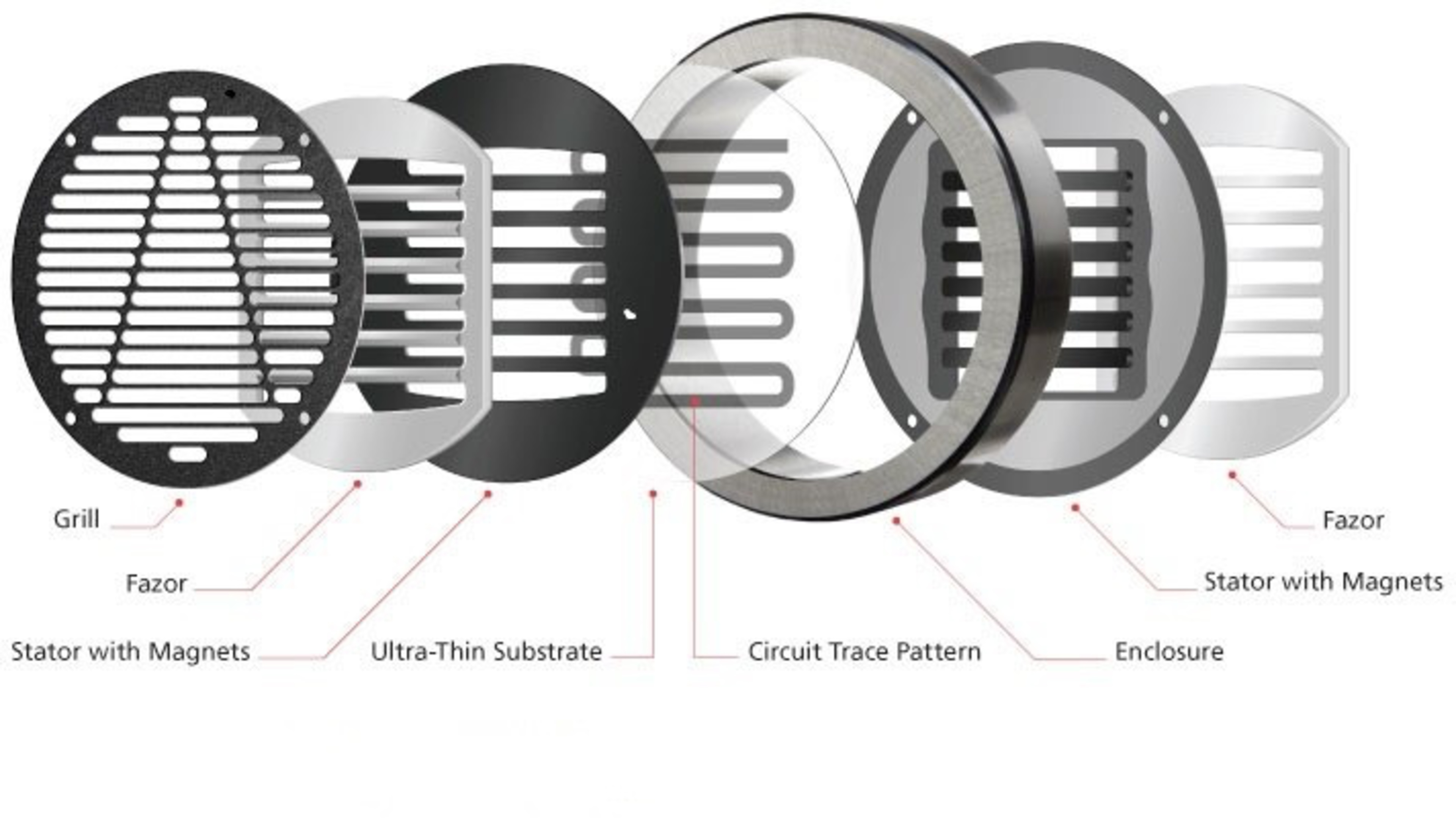 Planar magnetic drivers (also called orthodynamic or isodynamic drivers) take a different approach. They use an ultra-thin, flat diaphragm with a conductive wire pattern embedded across its surface, stretched taut within a frame. Arrays of magnets on one or both sides create a magnetic field that pushes and pulls the entire diaphragm when an audio signal flows through the traces. In effect, the diaphragm acts as a large, flat voice coil. The movement of this flat membrane produces sound waves, similar in principle to a dynamic driver but with the force spread out across the diaphragm rather than only at a coil in the center.