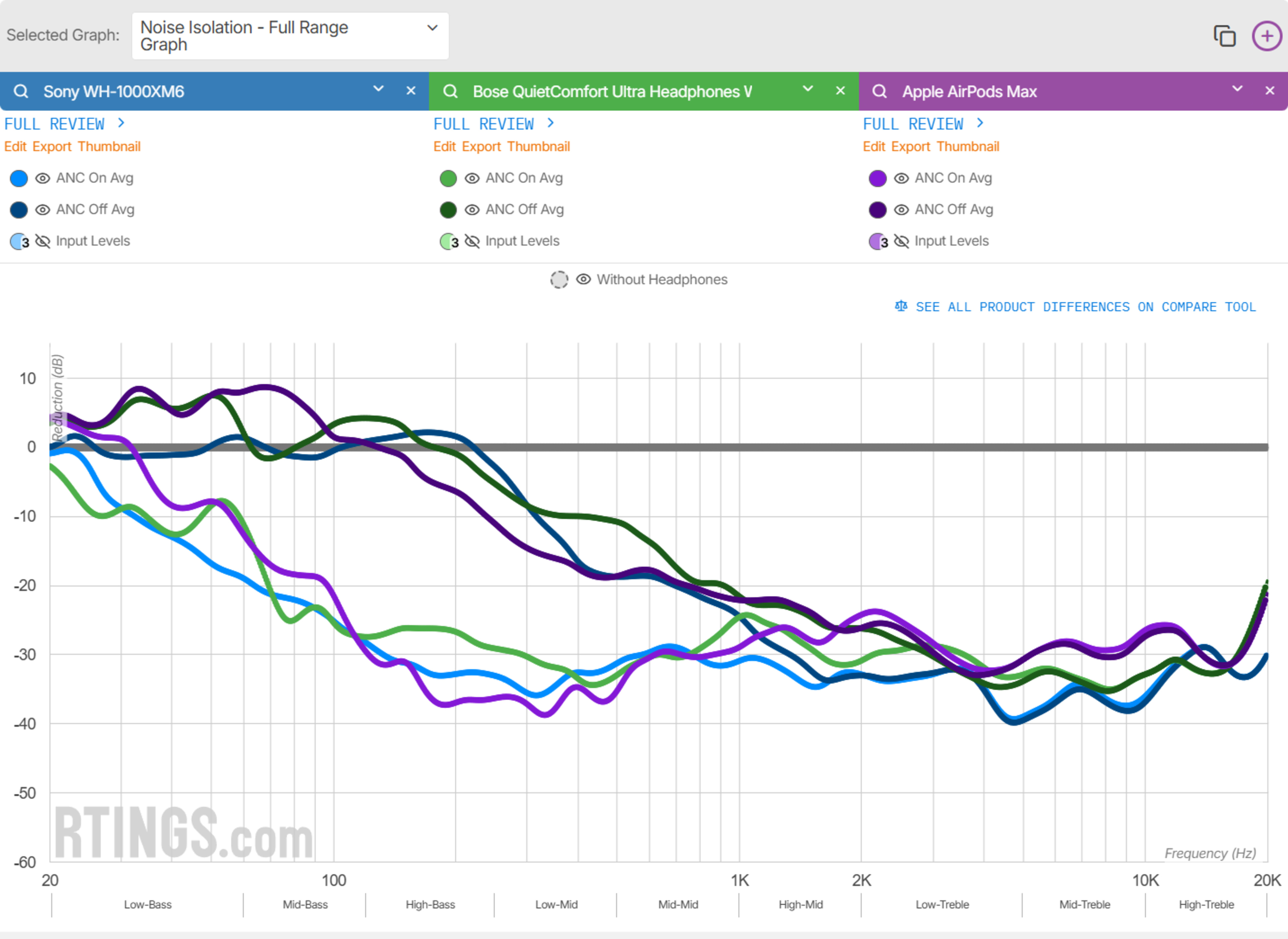 The following graph presents the full range pink noise attenuation performance of some popular ANC headphones. We use a pink noise signal because it allows us to account for the response time of some headphones' ANC systems (more on that later). In broad terms, the bass range includes noises like airplane noise and semi-truck engine rumble, while the mid and treble ranges include noises like people talking, dogs barking, or bus brakes screeching.