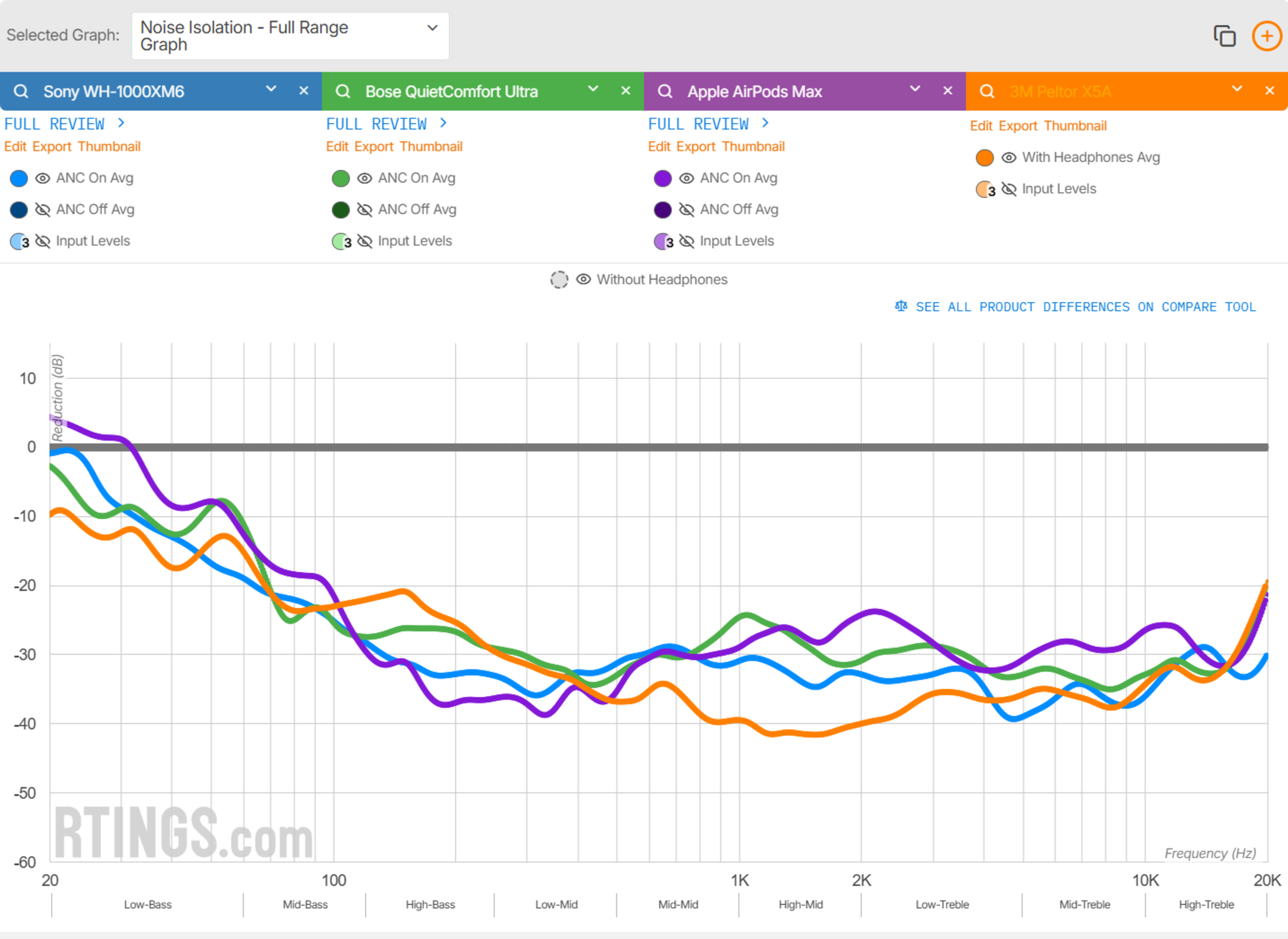 Our new noise isolation tests, developed for test bench v1.7, allow us to compare the performance of ANC headphones in a fairer and more approachable way. As ANC algorithms change how they handle background noise, a simple sine sweep isn't sufficient to evaluate the real-life performance of the headphones. Instead, we've updated our tests to use both pink noise signals and actual background scenarios to better test the noise attenuation capabilities of headphones with both data-focused and user-relatable metrics. Throughout our exploration-focused process, we took the opportunity to put a pair of 3M Peltor X5A earmuffs through our new testing to see how they fare against some of the best ANC headphones on the market.