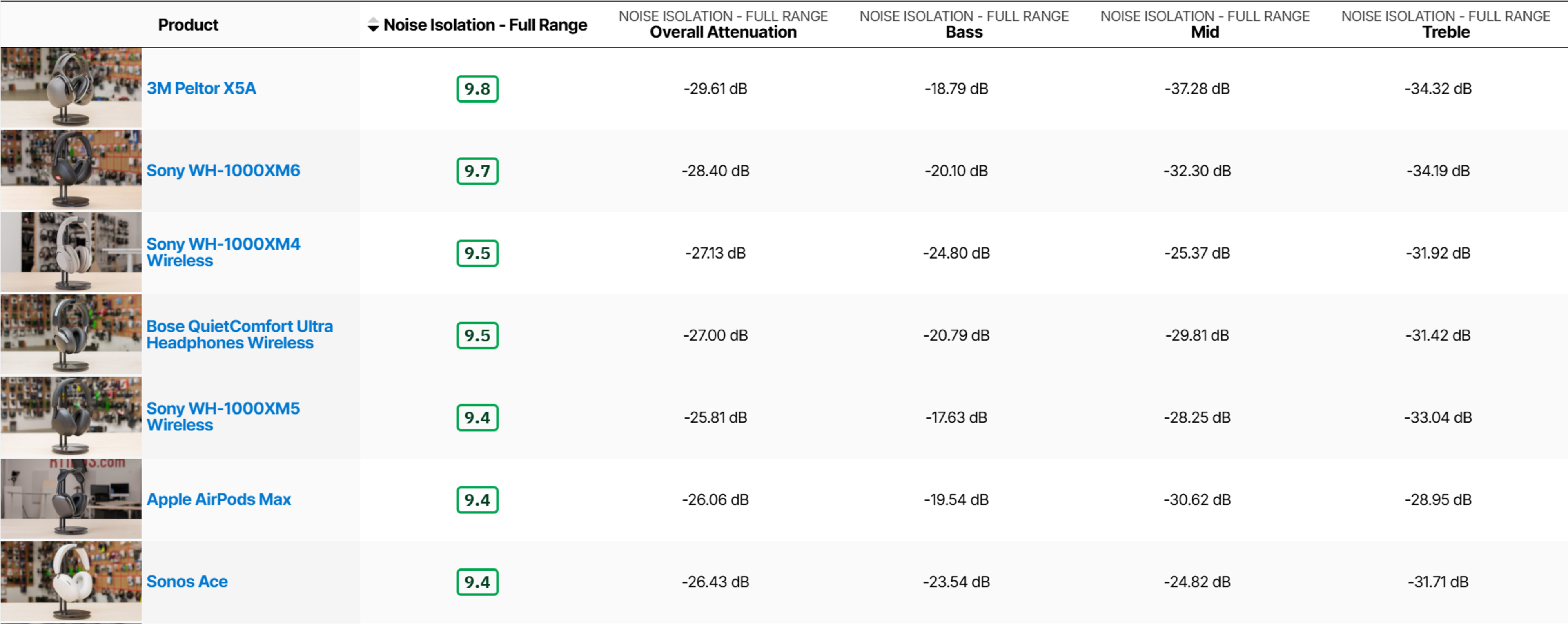 As you'd expect from purpose-made earmuffs designed and certified to attenuate very loud noises, the 3M Peltor X5A perform at the top of the pack. That said, ANC headphones can get quite close in performance and may perform better than earmuffs depending on the frequency ranges.