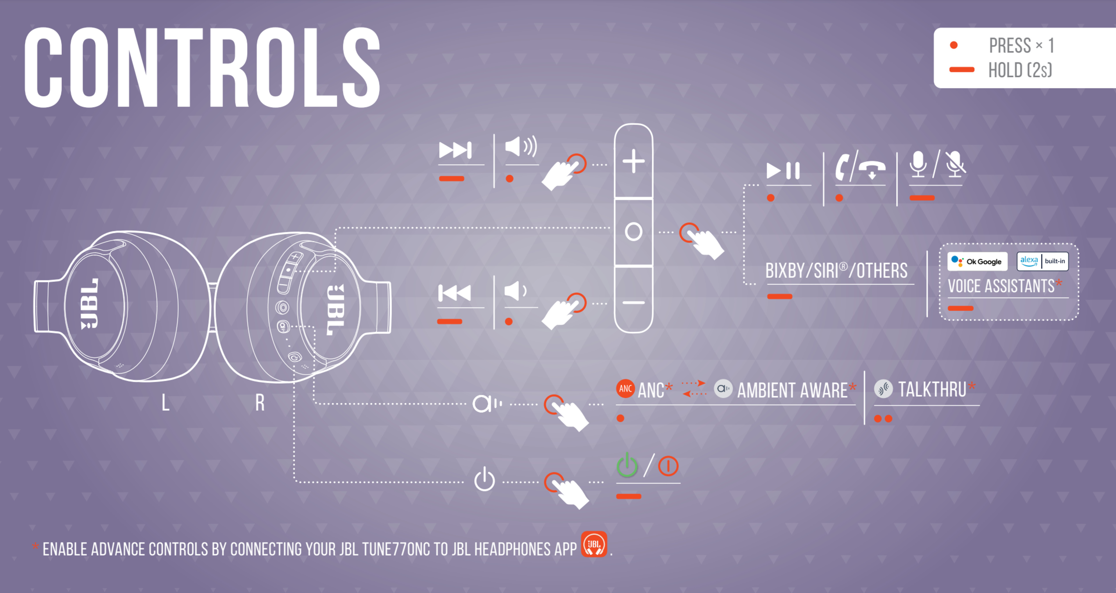 JBL offers two related modes. Ambient Aware is their standard transparency feature, while TalkThru is designed specifically for conversations: it lowers your music volume and boosts vocal frequencies picked up by the microphones, making voices sound clearer while you keep your headphones on. On models like the JBL Tune 770NC, you can switch between these modes with the ANC button or just use the companion app, as explained in the next section.