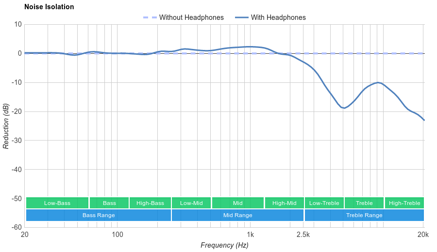 Poor leakage. Although these headphones are marketed as semi-open, their isolation is on par with fully open headphones. Therefore, they provide no isolation up to 2KHz, and the isolation they achieve above 2KHz is well below average.