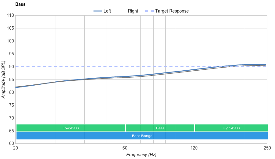 Decent bass range performance. LFE is at 79Hz, which is below average. Low-bass, which is responsible for low-end thump and rumble, is lacking by more than 5dB. Mid-bass, which is responsible for kick and punch, is also lacking by more than 2dB, resulting in an overall bass that is lacking a little in thump and punch.