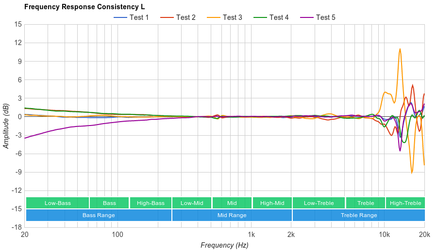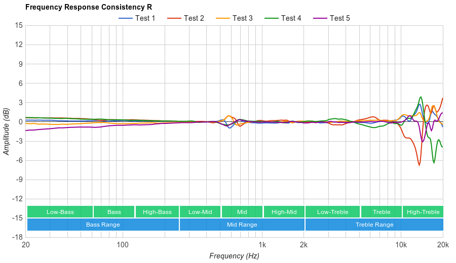 Great frequency response consistency. Like most other open-back headphones, the AKG K701 has very good consistency in delivering its bass. The maximum deviation we recorded was 3dB at 20Hz, on only one of our human subjects. The treble range consistency is also great with the K701, however, at higher frequencies they are prone to larger deviations because of their large ear cups.