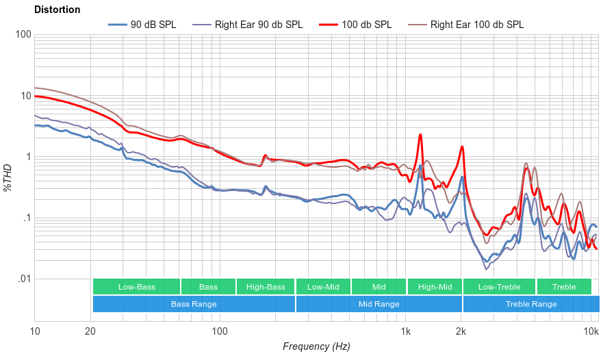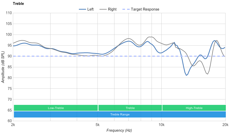 Above-average treble range performance. Low-treble is overemphasized by about 3dB, adding a bit of excess brightness and detail to vocals/leads. They also show more than 4dB of overemphasis in mid-treble, increasing the presence and sibilance of vocals and lead instruments.