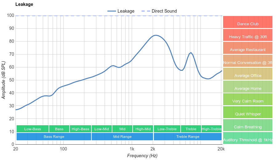 Poor leakage performance. The significant portion of the leakage is spread from 200Hz to 20KHz which is quite a broad range. The overall level of the leakage is also quite loud, making the leakage of the K701 audible to those around you.