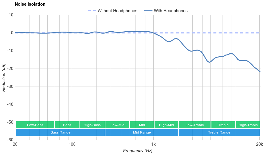 Poor isolaton. These headphones don't offer any isolation below 1KHz, which is expected of open-back headphones. Above 1KHz, there is a 3dB/Octave roll-off present, which won't be effective in blocking outside noise.