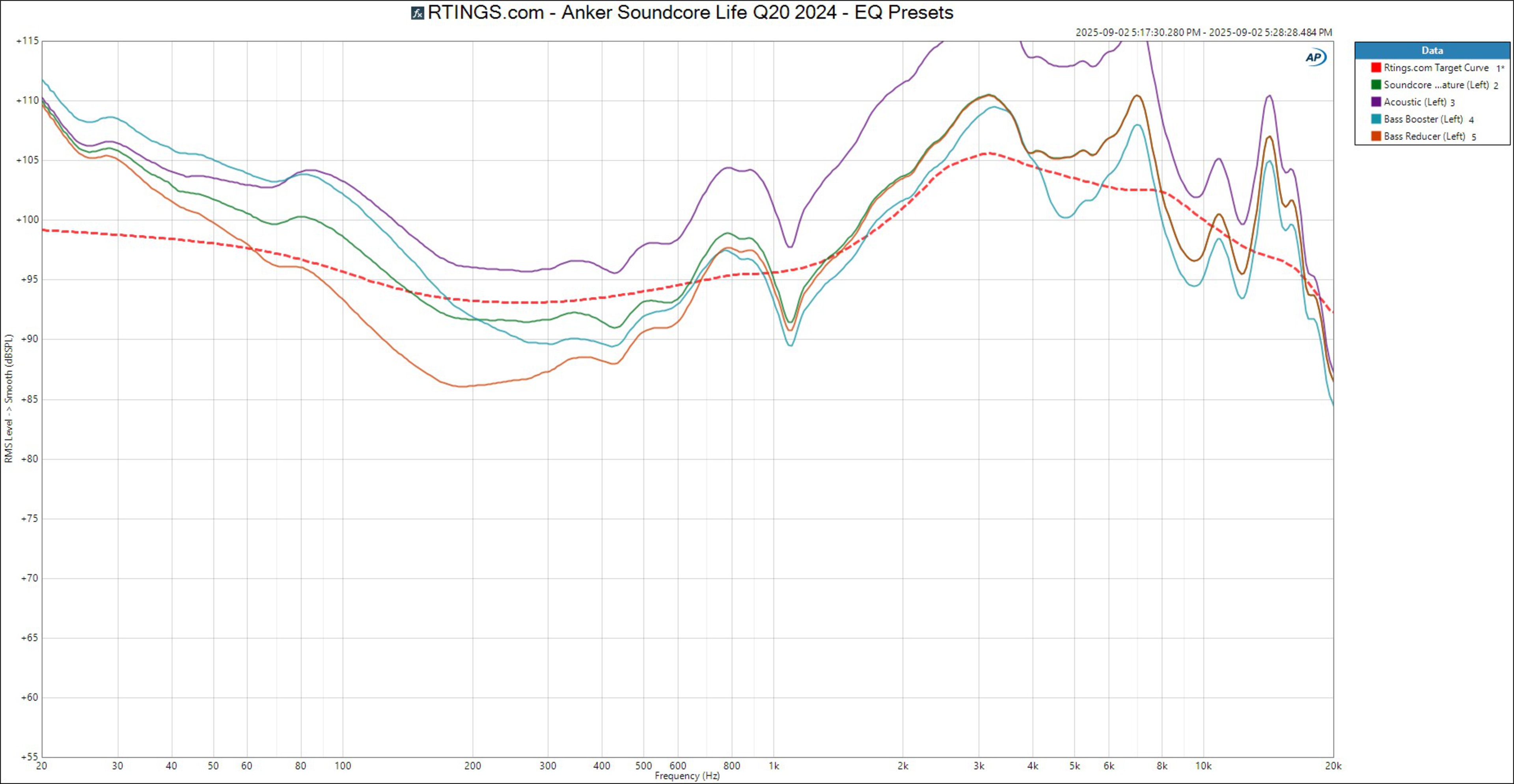 The Anker Soundcore Life Q20 2024 have a V-shaped sound profile, with more low-end and treble presence than our target curve, though it's not quite as exaggerated as the original Anker Soundcore Life Q20 Wireless. We tested them using the 'Soundcore Signature' EQ preset over a Bluetooth connection, but there's a huge variety of EQ presets to choose from (here's a graph comparing the five main presets).