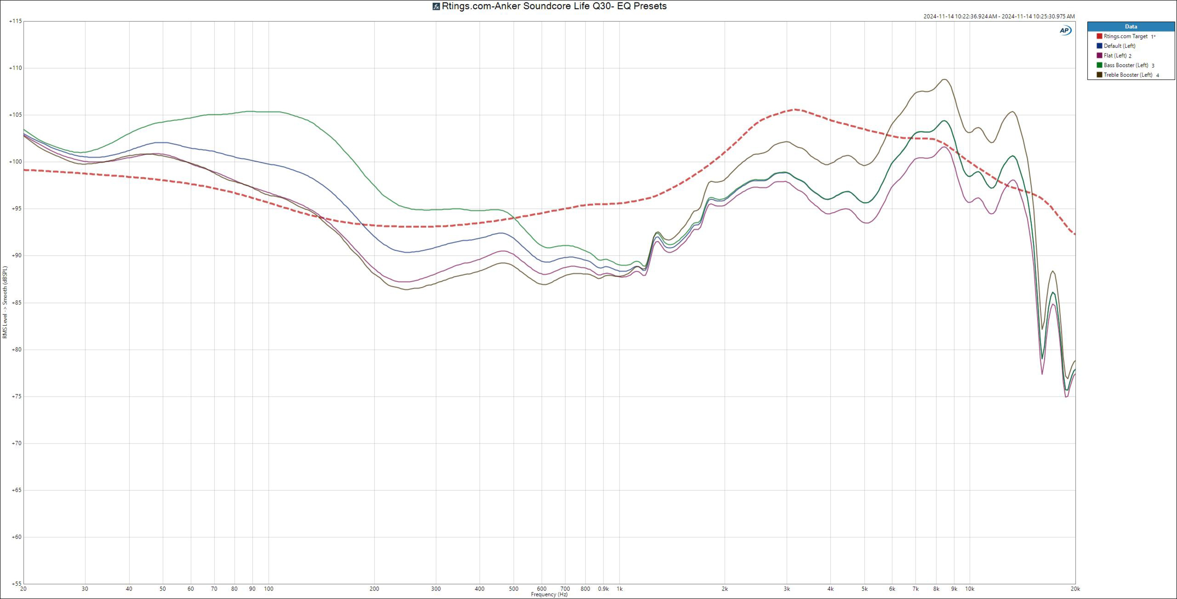 If you find this default sound profile overly bass-heavy, their companion app offers a graphic EQ and presets to help adjust the sound. Here are some measurements of a few EQ presets.
