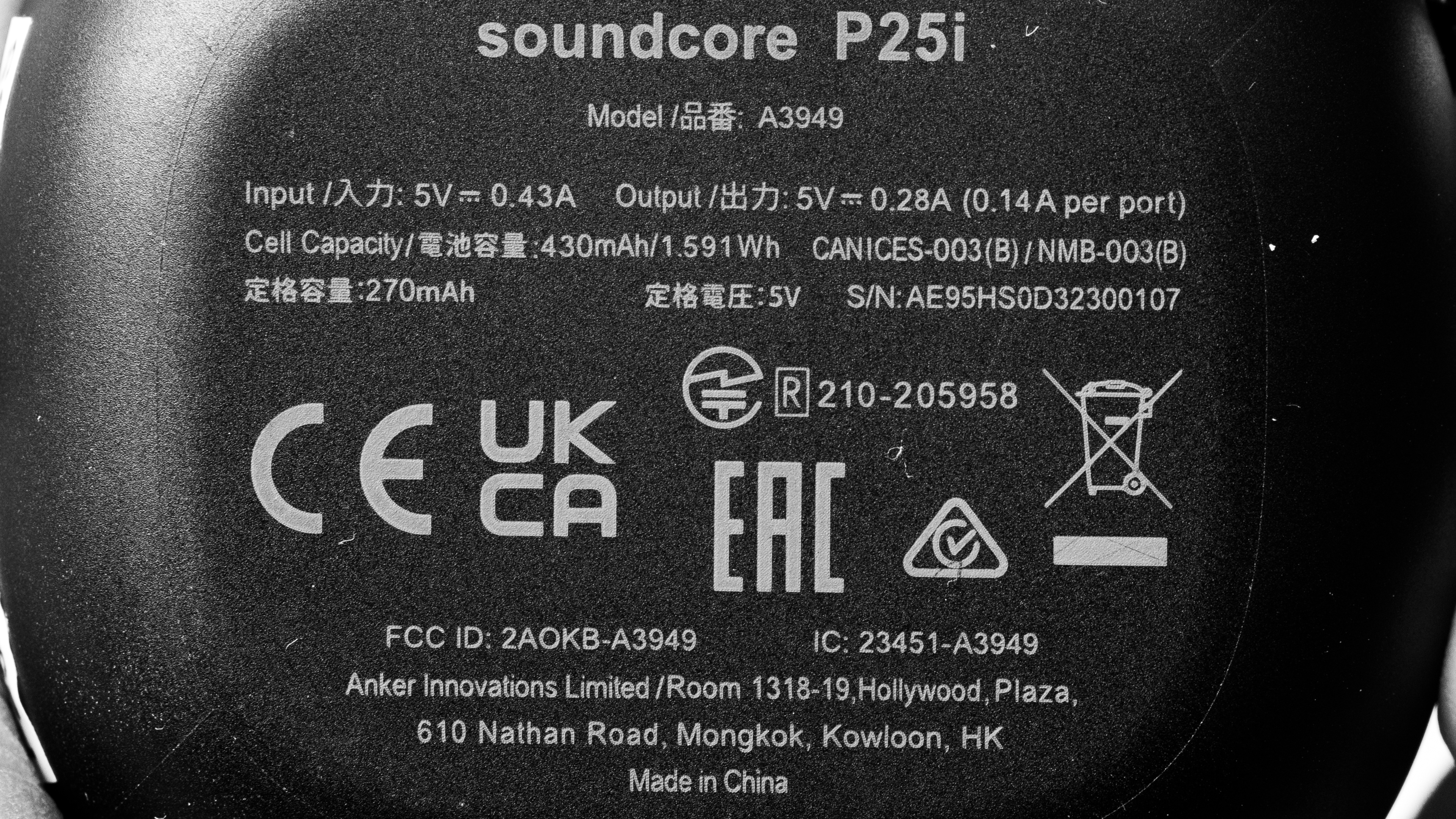 The Anker P25i come in one color variant: 'Black,' and you can see our model's label here. It's worth noting that these buds have a different name, depending on the retailer. Through Anker directly, these buds are called the P20i, but if you're shopping via Best Buy, for example, these buds are called the P25i. According to Soundcore, there isn't a difference between these two models other than their names.