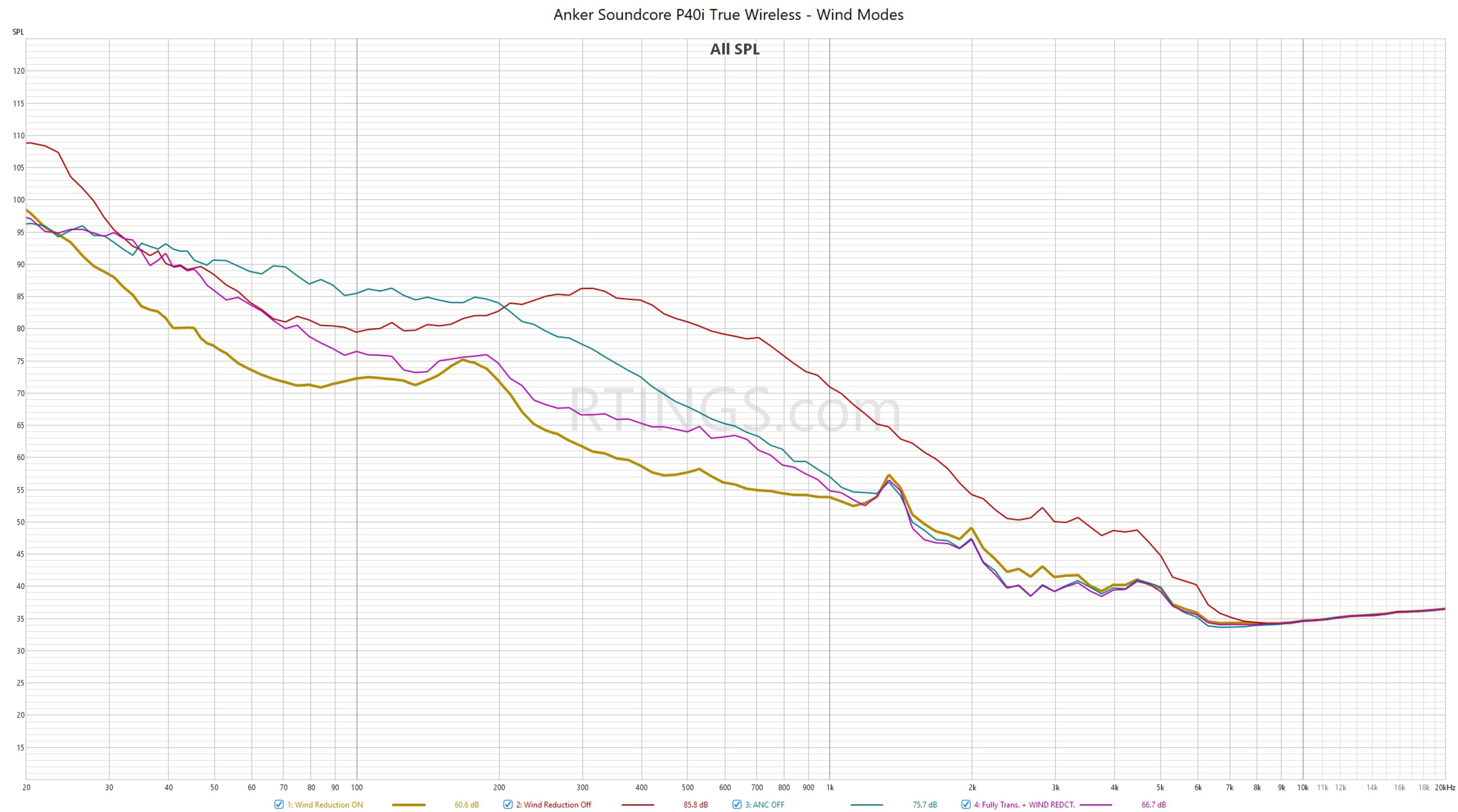 The Soundcore P40i have decent harmonic distortion performance. While there are unintended harmonics generated in the bass at high levels, they're not audible as we're less sensitive to lower frequencies. Although the graph shows fairly significant harmonic distortion in the mids and treble on our plot, you likely won't be listening to anything this loud, as high levels in this frequency range can be harmful to your health.