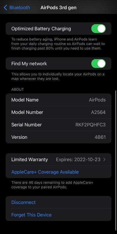 The Apple AirPods 3rd Gen don't have a dedicated app, but if you're using an iOS device, you can access some settings in the Bluetooth menu. You can toggle ear detection and Spatial Audio on and off, choose which earbud's mic to use, and optimize battery charging. You can also enable battery optimization and turn on 'Find My Network', which offers features for finding your headphones if you misplace them. Some features, like the earbuds playing a sound when inside their case or marking them as lost so others can't use them, are only available for this generation when using this specific feature.