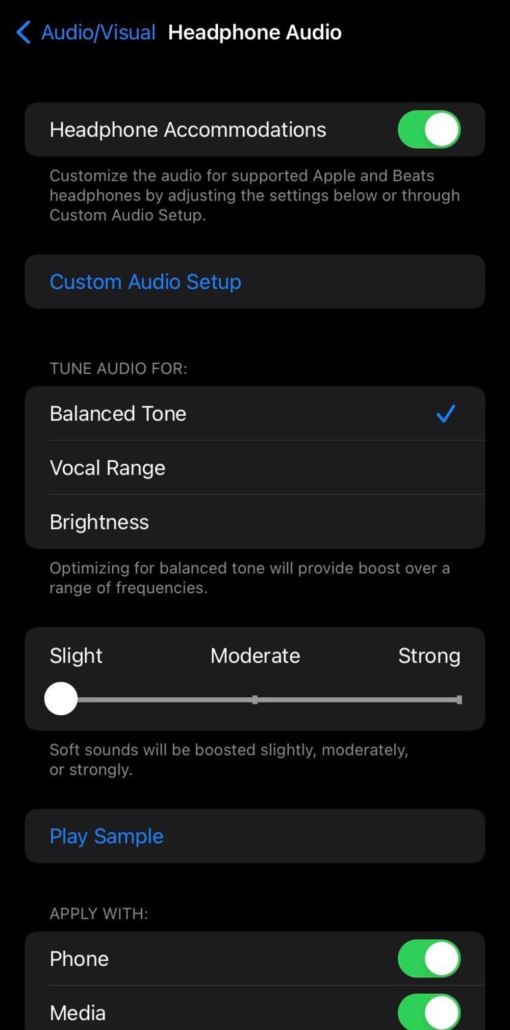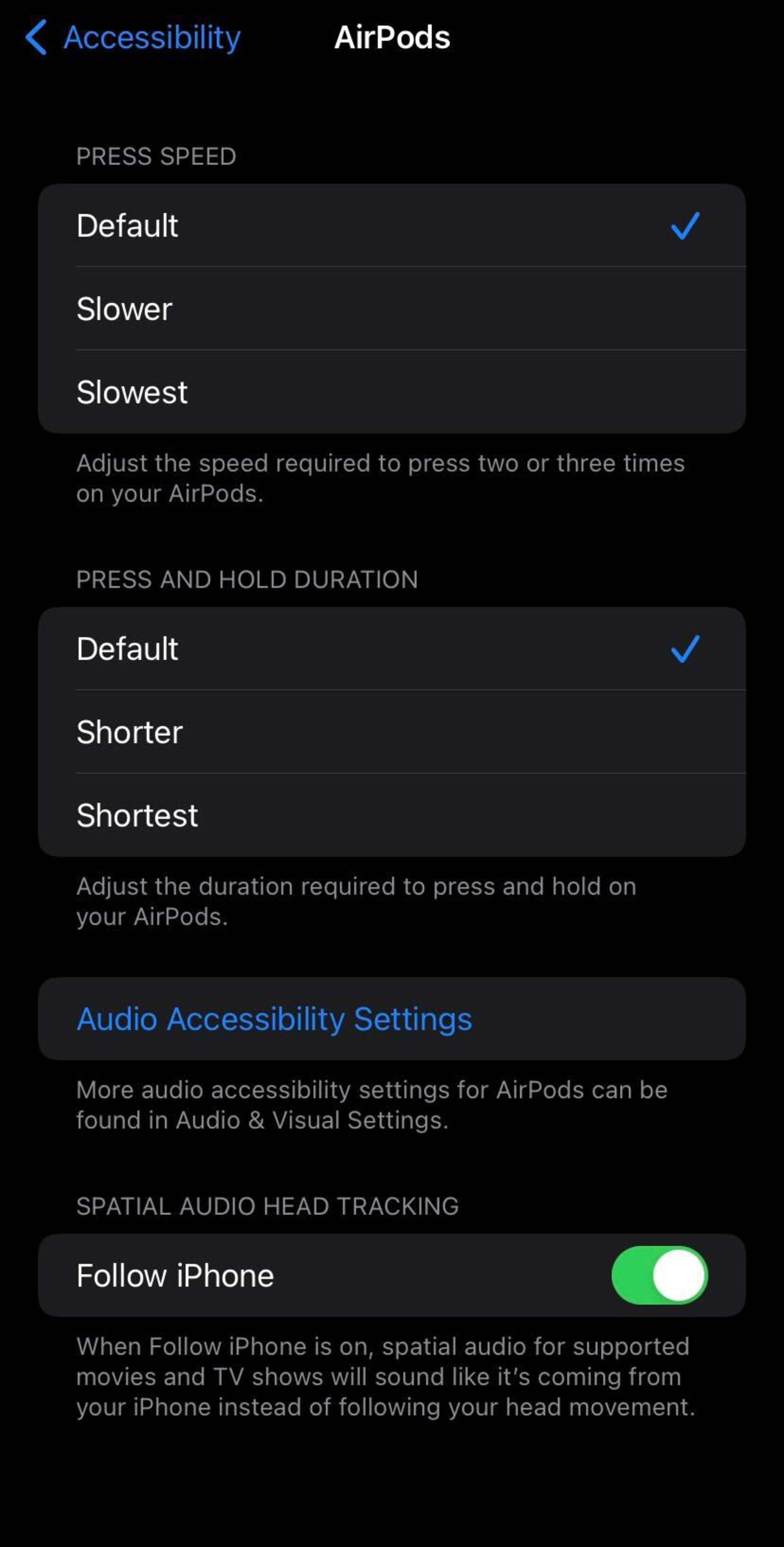 There are some additional settings in the Accessibility tab on iOS devices. You can choose to 'boost' certain sounds, like vocal frequencies, to make voices over the phone or dialogue in a movie easier to understand. However, this feature is also supported by the 2nd generation and the Apple AirPods Pro. You can also change how quickly you need to press the earbud stems to register a double or triple tap and adjust how long you need to hold the sensor down for a long press. However, we don't consider these 'Accessibility' settings part of the app.